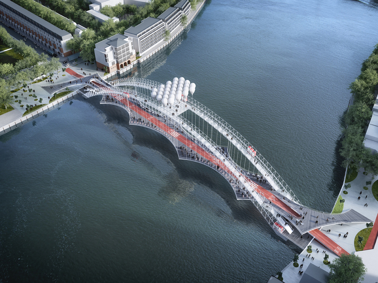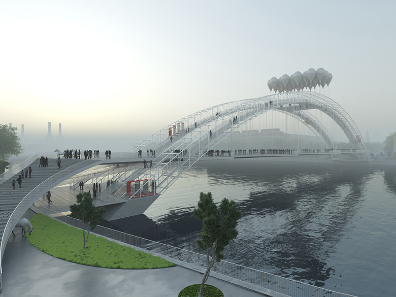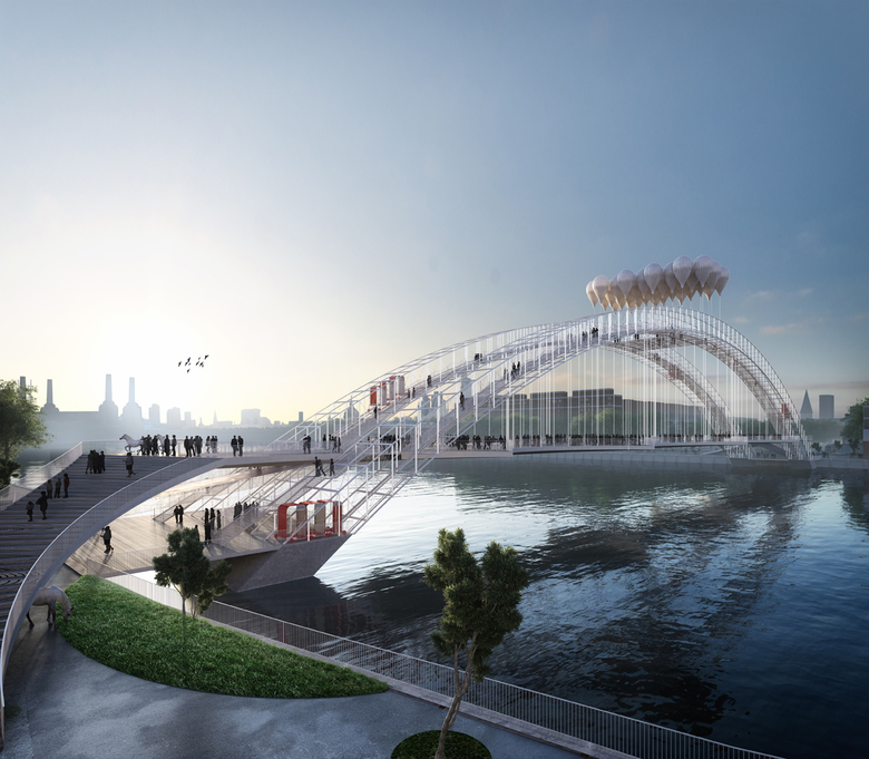 Framing London … Within a beautifully engineered portal. The bridge is also a platform for enjoying London - a landmark in its own right, the scale of the structural challenge is harnessed to discover a new public realm, high above the town. Pick up a pen, let’s draw a bridge together! ... Free from the stress of structural grids, the design of the suspended deck areas is a community project just waiting to happen. We don’t see our proposal as a final project but much more as the starting point for a good heated debate! The diversity of communities and the delicate urban challenges in proximity to the proposed footbridge argue in favor of a design process which excludes no one…and should result in a project loved by everyone! Getting from A to B … Integrating cycle and pedestrian traffic via separate spring-points and with a dedicated central bike highway. A no nonsense approach for quick two-wheeled travel, freeing lateral spaces for the luxury of a daily stroll. A continuous deck surface links both zones, allowing this new public square to evolve with the town. This memorable structure will provide open space platforms, openness with clear sight lines for all the bridge users. It will be served by two large safe stairs and two mechanic cabins to take everyone to the top deck. Designed by all open to all, loved by all. Low Impact … Our environmental strategy will be developed around the opportunities that the site has to offer. Finding systems and materials which can be sourced and made within a reduced perimeter is key to controlling the structure’s global impact. Analyzing the life cycle of the components of this footbridge is fundamental to our approach. Finding materials who challenge the durability, maintenance costs and carbon footprint of traditional methods can also open up new opportunities for design. The new footbridge should show the utmost respect for the local environment; its scale, order and density but also all the specific objects events and greenery which go up to make a neighborhood what it is. A Structural approach … Structurally, the footbridge is made of two space frame arches. Their efficiency allows us to span the entire Thames crossing in one large leap, largely catering for the fluidity of river traffic between supports. The two arches provide us with a continuous upper support from which could be suspended a variety of deck forms. This has the added value of freeing the bridge engineering works from the timely process of community design. The structural height and limited bracing elements within the space frames are capitalized to create a pathway within the arch which culminates in the observatory platform. The observatory platform itself serves the structural function of acting as a wide strut, linking the two arches and increasing their stability. We envisage applying form finding techniques for the optimization of the both the geometry and the beam sections of the arches, thus rendering this structure as delicate as possible.