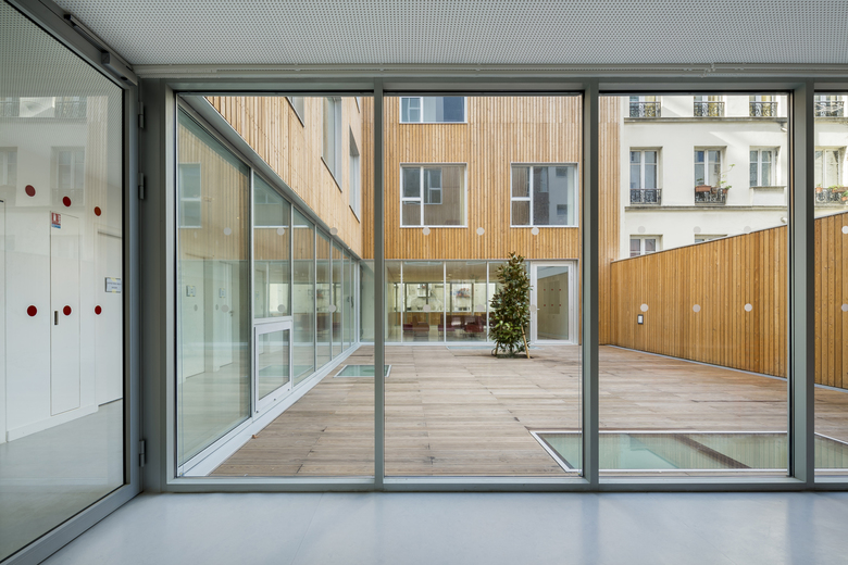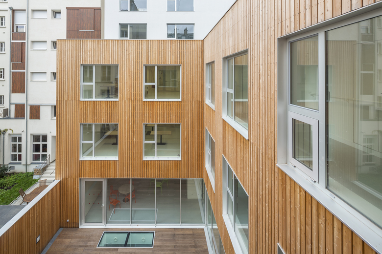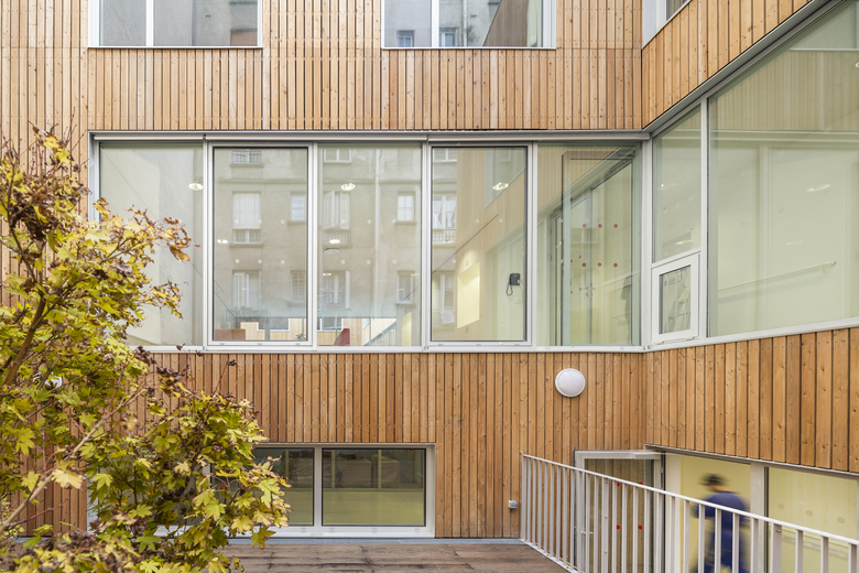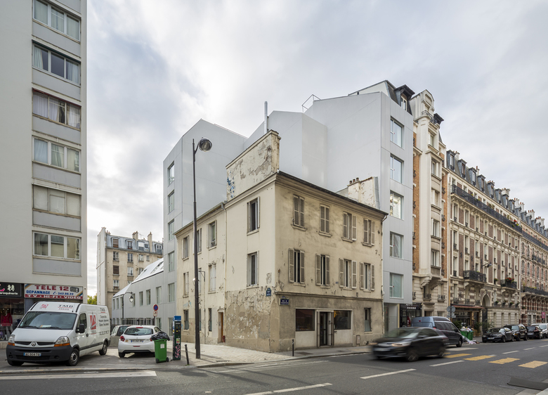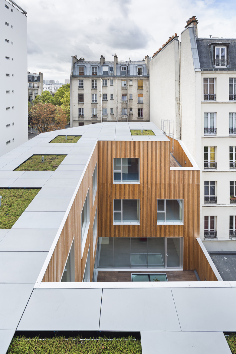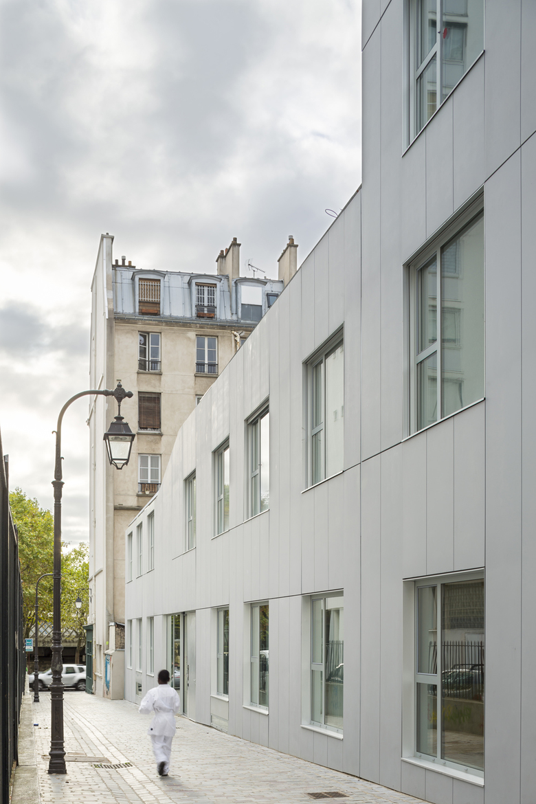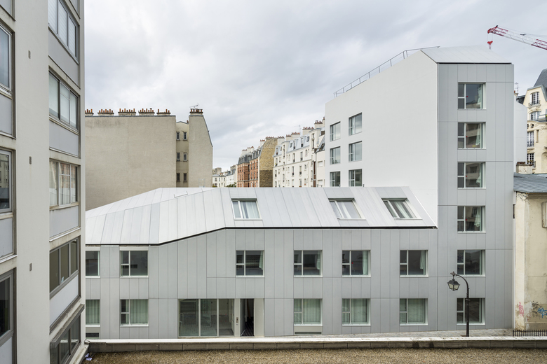 In the Parisian urban context of a high density, the project’s site presents an interesting potential. The form of the building is the result of a pragmatic approach and a determination to express the volume in terms of “a material that fills the negative” of the site in which it rests. Facing ruelle de la Planchette, the building’s upper part bends following the authorized template; thus softening the volume. The exterior skin, protective, smooth, thin, of a neutral color, faces the city. Facing rue de Charenton, the site’s shifting in form led us toward the use of volumes of surprising proportions, which fold into the roofing, the whole covered with the same material. Inside the building is laid around two courtyards planted internally; natural light is present in all the living spaces, and thus also the horizontal circulations. The substantial work regarding the various thicknesses and qualities of the facades marked our determination to distance ourselves from a monotonous “establishment” image. The rapport between the building and the city surrounding it being one of our principle concerns.