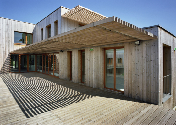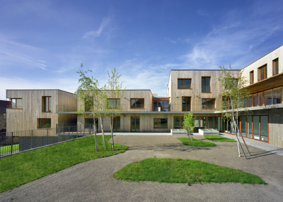 This retirement home is located on the heights of Riedisheim (a suburb of Mulhouse), in a residential neighborhood. The conjunction of geophysical and regulatory constraints rendered this plot of land difficult to build upon : its elongated form, its gradient exceeding 10%, and the very restrictive POS regulations applicable to it were a priori incompatible with the size and demands of the project. These conditions led us to develop the entire project within a construction adopted to the form and constraints of the land. The building unfolds in length from east to west, while its height, made of up of four trays slightly shifting away from one another, follows the natural slope. The roofs, visible from the principal access road located at the top of the plot, are all planted, which helped dampen the impact of construction in the neighborhood.