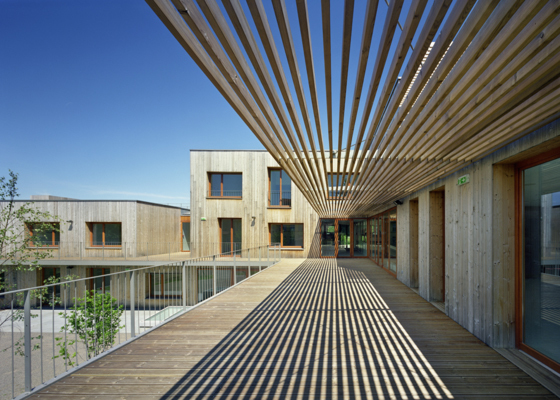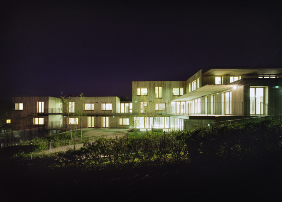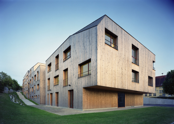 We divided the length of the building into little modules the size of several rooms, in order to better integrate the length within the residential environment. These interruptions bring about the entry of a generous amount of natural light into the interior circulatory paths of all floors. The building complex is covered in wood, whose reassuring touch is present at the center of the lives of residents.