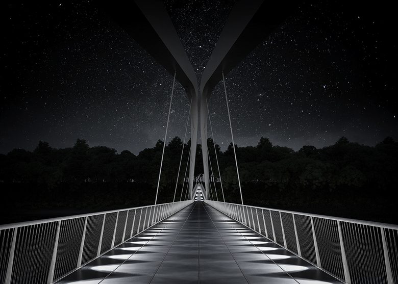 Simple and free of superfluous details, this soft line follows the forces over the bridge and thus highlights the beauty of the structure: Harmony and balance. Two terms that characterize this bridge. The bridge crossing is a special experience. The landings of the bridge correspond to site-specific conditions and allow therefore a variety of views on the Rhine and its surrounding.