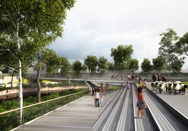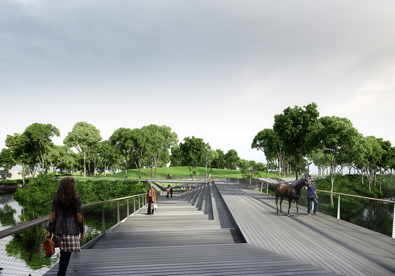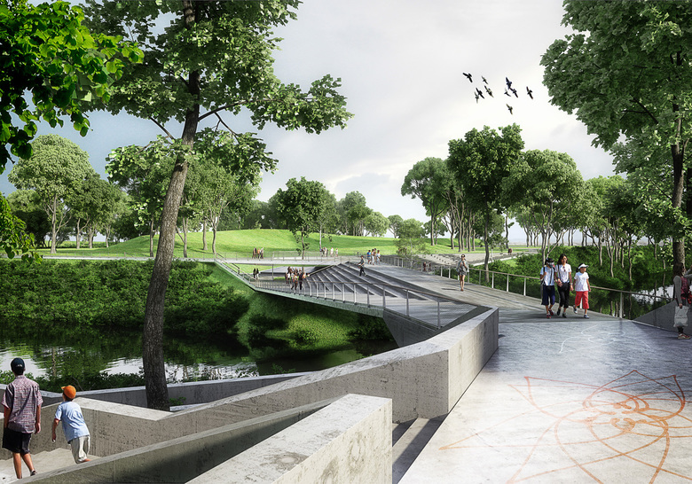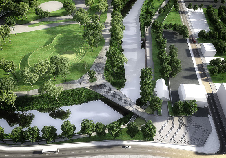 The scope of this project is to provide a new crossing for pedestrians, over the River Irwell from the A6, to The Meadow on the North of the river. It will help to unlock the vast development potential of a major corridor linking Salford and Manchester. The plan is a symmetrical Y, composed of three folded platforms, one being The Bridge. The other two platforms are ramps and terraces that extend along the river, wrap the landscape sculpture and lead people to the existing boardwalk. The entire structure is folding such as to absorb the four meters of difference in level between the two sides of The Irwell River. The superposed platforms allow a soft landing on the shore of Meadows. We see the project as a first element of a future development of The Meadows. It will become a versatile element, a space for contemplation and entertainment, a promenade and a landmark. The Bridge should be an attraction; it can host sports and cultural events. It can encourage exchanges and communication between people and become a true playground. The structural scheme is a Steel Box Girder supported by a single pillar, over a span of 57m. The Bridge beam will be anchored to the concrete pillar, and blocked on the opposite side. Steel Box Girder construction allows considerable freedom in the geometry of The Bridge and an easy maintenance. The dynamic effects will be reduced by folding the deck.