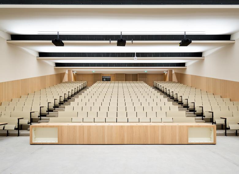 Städtebau – Besondere Sorgfalt galt der Definition und Integration des Bauköpers in die bestehende städtebauliche Situation. Der Neubau orientiert sich an den bestehenden Traufhöhen der Nachbarliegenschaften an der Peter-Jordan-Straße. Wenige, präzise gewählte Eingriffe gliedern den Baukörper. Baukörper Der Neubau reagiert in seiner Maßstäblichkeit angemessen auf seine Umgebung. Es ist eine grundlegende Entscheidung des Entwurfs, das oberirdisch errichtete Volumen (54% BRI) baurechtlich nicht maximal auszunutzen sondern möglichst viele Nutzungen unterirdisch (46% BRI) anzuordnen. Ein eingeschnittener Patio schafft belichtete Flächen im ersten Untergeschoss. Dadurch wurde bewusst auf die Errichtung eines Staffelgeschoßes verzichtet und so auch die Möglichkeit einer späteren Erweiterung geschaffen. Trotz der Widmung in zwei unterschiedliche Trakttiefen und zwei unterschiedliche Gebäudehöhen tritt das Gebäude durch die gewählten Fluchten als ein Baukörper in Erscheinung. Fassade Die vertikalen Holzlamellen und die horizontalen Bänder ändern das Erscheinungsbild des Gebäudes je nach Blickwinkel von Durchlässig bis zu Plastisch-Kompakt. Das umhüllende Lamellenwerk betont in seiner formalen Selbständigkeit den solitären Charakter einer signifikanten Architektur. Es bindet aber auch die beiden volumetrisch sehr unterschiedlichen Gebäudeteile zusammen. Die öffentlichen Bereiche des Gebäudes werden durch Halbierung des Fassadenrasters der Lamellen betont und bilden einen transparenteren Sockel.