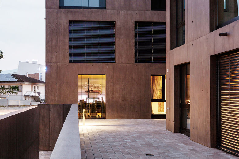Widnau ist die jüngste Gemeinde im Kanton St. Gallen, geprägt vom dynamischen, wirtschaftlichen und gesellschaftlichen Wandel des 20. Jahrhunderts. Die städtebauliche Entwicklung beginnt langsam zu greifen. Dörfliche Strukturen beherrschen nach wie vor das Ortsbild. Die Wahrung dieses Charakters und das Erfüllen der Vorgaben des Denkmalschutzes waren für die Planung der Wohnanlage an der Kreuzung Fuchsgasse wesentliche Vorgaben. Anleihen an der Architektur des Rheintalhauses zu nehmen, einem hölzernen Blockbau in Kopfstrickbauweise und gemauertem Kellergeschoss, war naheliegend, weil sie sich für die Wohnanlage mit ihren 21 Wohnungen als zweckmäßig erwiesen hat. Die Wohnanlage reagiert mit ihren zwei in Elementen stark reduzierten Blöcken harmonisch auf ihr Umfeld, signalisiert Torwirkung, vermittelt Leichtigkeit. Die Materialität und die Farbe der Fassade sind der traditionellen Holzbauweise nachempfunden.