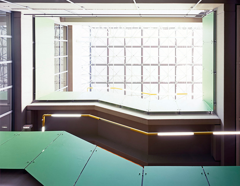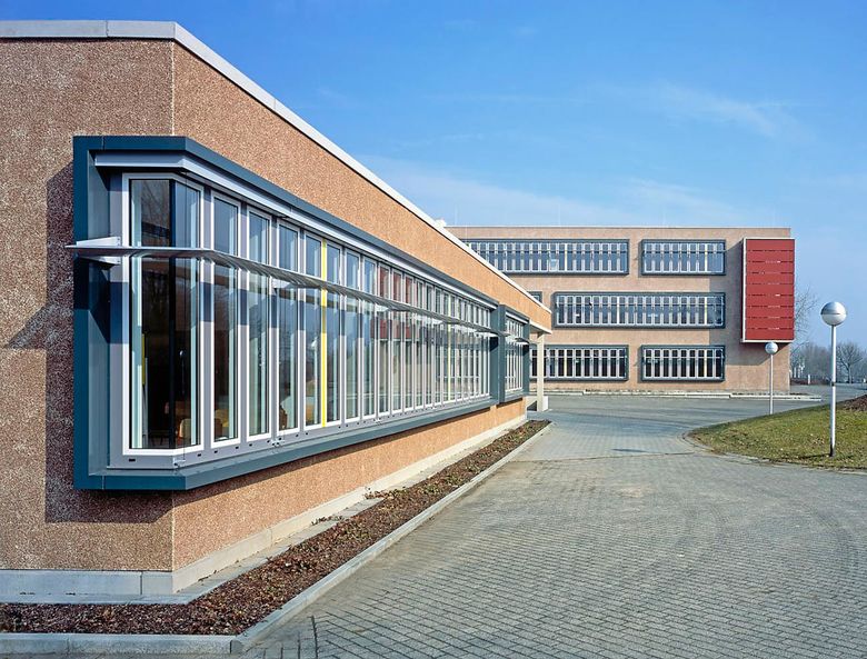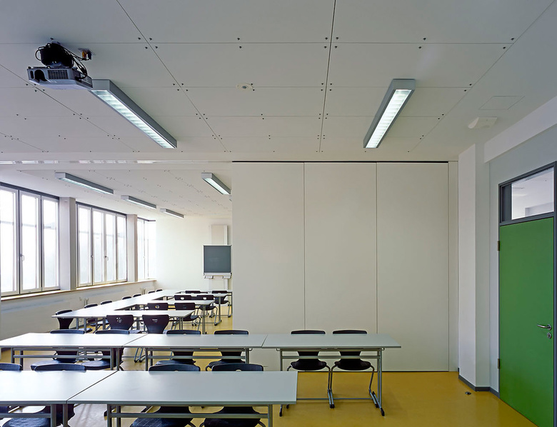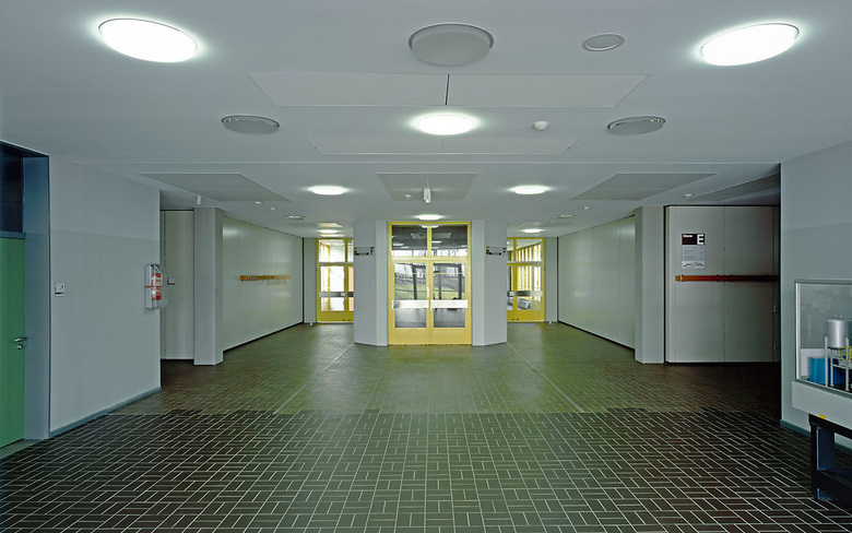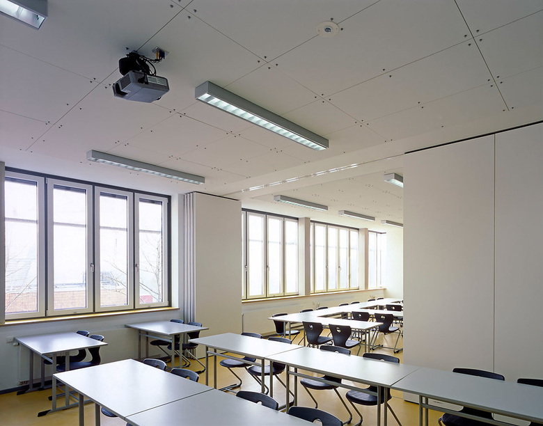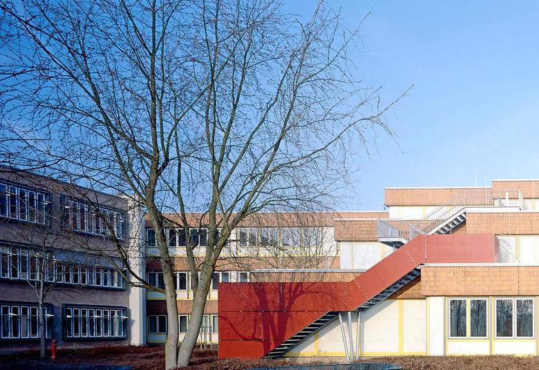 Drei funktional unterschiedliche Bereiche wurden in den Bestand eingepasst. Die Klassenräume sind in einem 3-geschossigen Klassentrakt zusammengefasst, im Erdgeschoss beinhaltet dieser ausserdem den EDV-Raum. Durch den schmalen Anschluss des Klassentraktes an den Bestand wird die bestehende Fassadenfläche mit den dahinter liegenden, zu belichtenden Räumen nicht eingeschränkt.