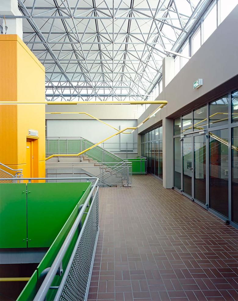 An einen vorhandenen Flur, der bisher nur einspännig genutzt wurde, sind nun ein Büro, ein Schülervertretungsraum und ein Aufenthaltsraum angegliedert. Zusammen mit einer überdeckten Pausenfläche, die den zweiten Zugang formuliert, und dem Werkraum mit angeschlossener Klasse bildet dieser Eingriff den zweiten Bauabschnitt. Zwei Raumerweiterungen im Bereich der Werkstätten schließen die Maßnahme ab.