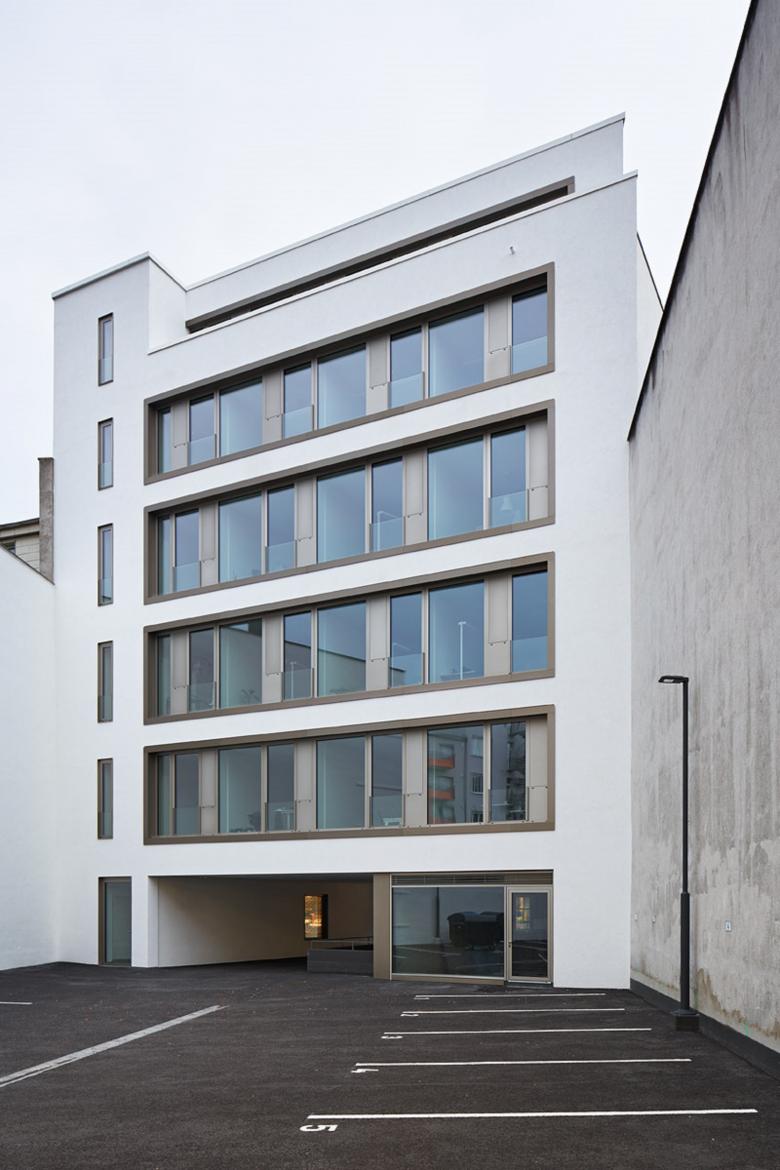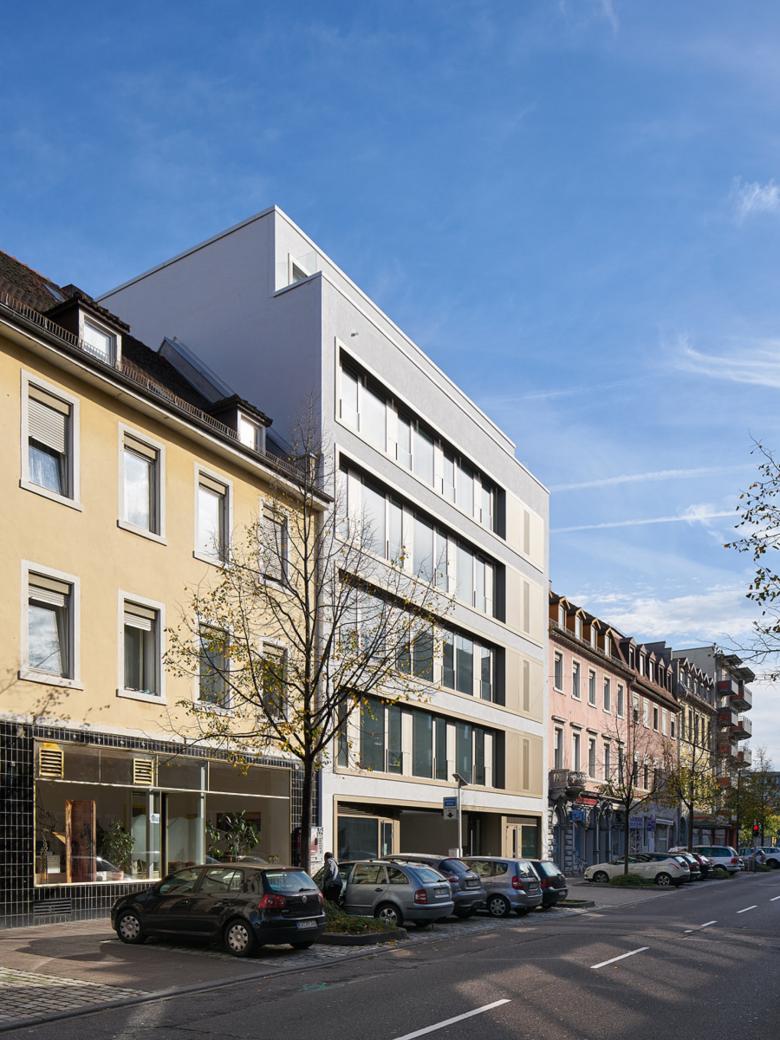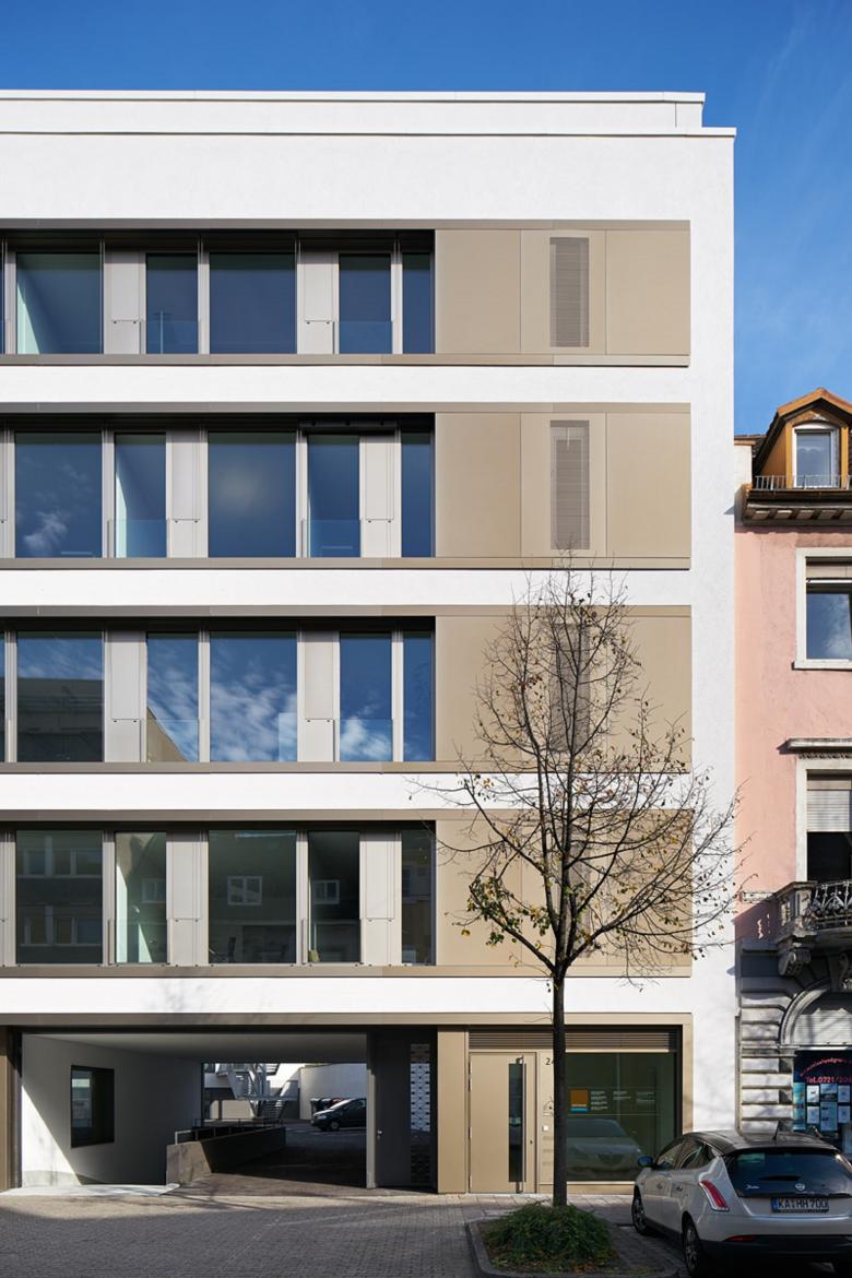 Ein Bürogebäude aus den sechziger Jahren des vorigen Jahrhunderts sollte baulich wie energetisch saniert und auf modernsten Bürostandard gebracht werden. Gelegen inmitten eines der schönsten Altbau-Ensembles Karlsruhes, war es unser Ziel, das Gebäude durch eine maßstäbliche und zugleich klassische Gliederung in Sockel, Prospekt und Attikabesser in den Altbestand einzufügen, ohne seine Modernität zu leugnen. Die bauzeittypische Bandfensterfassade wurde beibehalten, aber mit überdimensionalen Einfassungen den Sandsteingewänden der Nachbarhäuser angeglichen. Wie Schaukästen sitzen die Ausschnitte in der Fassade und zitieren damit ein bekanntes Motiv der ortstypischen Bebauung. Eine hochwertige Materialität aus Glas, bronziertem Aluminium und weißem Putz zoniert den „Klotz" ebenfalls hinunter und nimmt den Kanon der Blockrandbebauung auf, ohne sich anzubiedern.