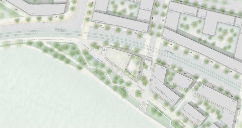 Die Akademie zeigt sich als selbstbewusster Solitär, der über eine transparente und gefilterte Fassadenstruktur, sowie gezielt gesetzte Loggien in Kommunikation mit dem Stadtraum tritt und so die Werte und Ziele der Muslimischen Akademie architektonisch umsetzt. Die Erdgeschosszone zieht sich als transparentes Glasband vom Langen Anger über die Landschaftstreppe bis zur Akademie Terrasse und öffnet sich somit einladend zu allen Seiten. Diese Einsehbarkeit und maximale Transparenz strahlt eine natürliche Anziehungskraft aus, zieht die Menschen ins Gebäude und heißt sie willkommen.