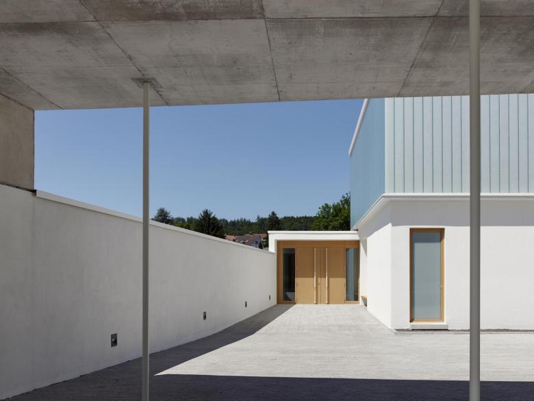 Durch die Anordnung der Parkplätze im von der Straße aus nicht einsehbaren hinteren, tiefergelegenen Bereich des Grundstücks rückt der Komplex ganz an den Kreisel. Der Vorplatz ist Teil einer subtilen Inszenierung eines schneckenförmig angelegten Weges vom Parkplatz in den Kirchenraum; Schritt für Schritt lässt der Besucher den Alltag hinter sich, wird ruhiger, kann sich sammeln, begibt sich in die Geborgenheit der Gemeinde und die Stille des Kirchensaales.