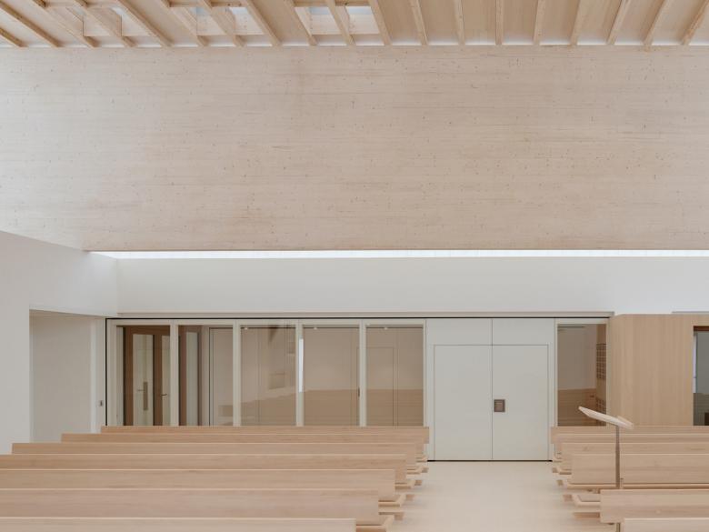 Der Gottesdienstsaal bildet das Zentrum der Anlage. Baulich wird dies in einem klaren Erscheinungsbild durch den transluzenten Aufbau aus lichtstreuendem Profilbauglas, durch den der Saal seine transzendente Wirkung erfährt, auch nach außen hin verdeutlicht. Die Fassade dieses Lichtkubus, der bei Abendandachten in den Stadtraum hinein leuchtet, erscheint je nach Blickwinkel und Lichtverhältnissen mal flächig glänzend, mal zart und filigran strukturiert. Das scheibenförmige Holztragwerk und die Beschränkung auf wenige Materialien tragen zu einer transzendierenden, hellen, ruhigen Raumwirkung bei. Von jedem Platz aus ist baulich ein uneingeschränkter Blick zum Altar gegeben, auch bei einer partiellen Erweiterung um das Foyer oder die Mehrzweckräume. Das Eingangsfoyer mit Garderobe, Brieffächern und Toiletten funktioniert unabhängig, sodass alle organisatorischen und damit die Stille und Konzentration störenden Tätigkeiten vor dem Betreten des sakralen Bereichs erledigt werden können.