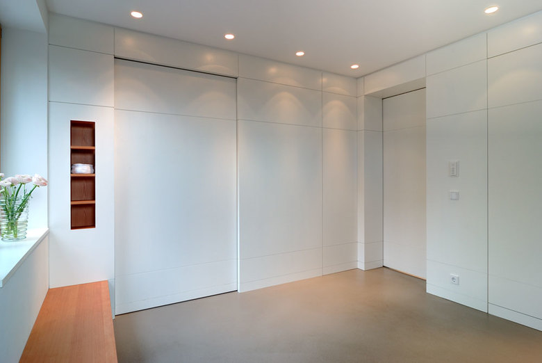 Die klare Funktionstrennung des Bestandsgebäudes wurde beibehalten: im Erdgeschoss befinden sich die Gemeinschaftsräume, wie Kochen, Essen und Wohnen, solange die Kinder noch klein sind und das Dachgeschoss bleibt zunächst dem Arbeiten sowie den Gästen vorbehalten; später wird es der Rückzugsraum der Eltern werden. Innerhalb dieser Struktur wurden jedoch vielfältige Änderungen vorgenommen: die Grundrisse wurden gestrafft, es entstand ein großzügiger Eingangsbereich mit Windfang. Entrée und Garderobe, die halbgewendelte Treppe wurde skulptural umbaut, sodass sie als durchgängiges Bauteil die einzelnen Etagen auch optisch miteinander verbindet.