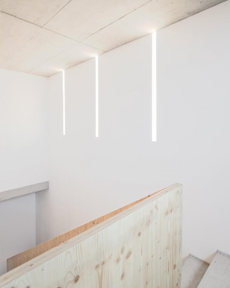 Das Gebäude ist in zwei Hauptzonen gegliedert. Die Funktions-und Erschließungszone mit Treppe, Technikraum, Bad und Abstellraum liegt an der nördlichen Grundstücksgrenze. Die Aufenthaltsräume orientieren sich nach Süden. Der Hauseingang befindet sich auf der Westseite und wird durch einen Einschnitt in der Kubatur artikuliert. Vom Eingangsbereich wird der Blick durch die Treppe nach oben ins erste Obergeschoss gelenkt. Der zweigeschossige Treppenraum vom ersten ins zweite Obergeschoss bildet das lichtdurchflutete Zentrum der Privaträumlichkeiten. Bad, Eltern-und Kinderzimmer sowie Wohnen und Arbeiten im zweiten Obergeschoss werden von hier erschlossen. Die nach Westen orientierte Terrasse erweitert den Wohnbereich und stärkt seine räumliche Qualität.