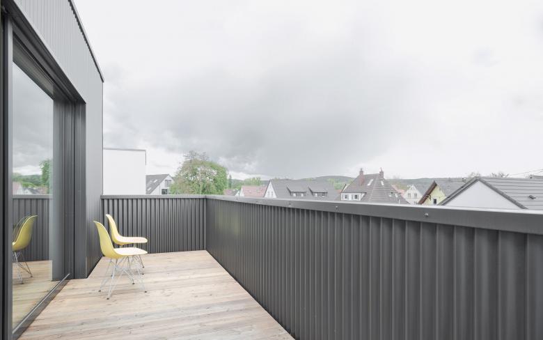 Die dunkle Wellblechfassade stärkt die körperhafte Wirkung des Hauses, das industrielle Material deutet auf den Standort eines ehemaligen Fabrikgeländes hin. Das energetisch optimierte Gebäude mit kontrollierter Lüftung und Wärmerückgewinnung besitzt eine PV-Anlage auf dem Dach. Diese versorgt neben dem Wohnhaus, das Elektrofahrzeug mit ausreichend Strom, um in die Innenstadt zu pendeln...