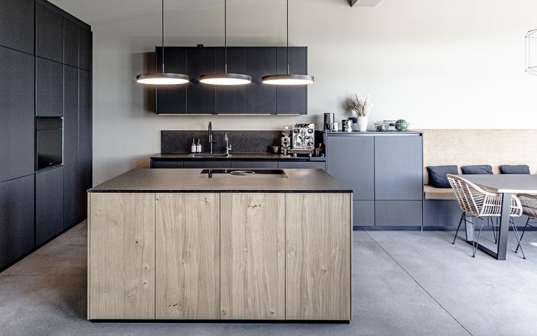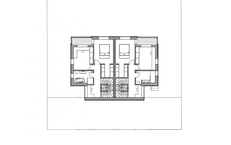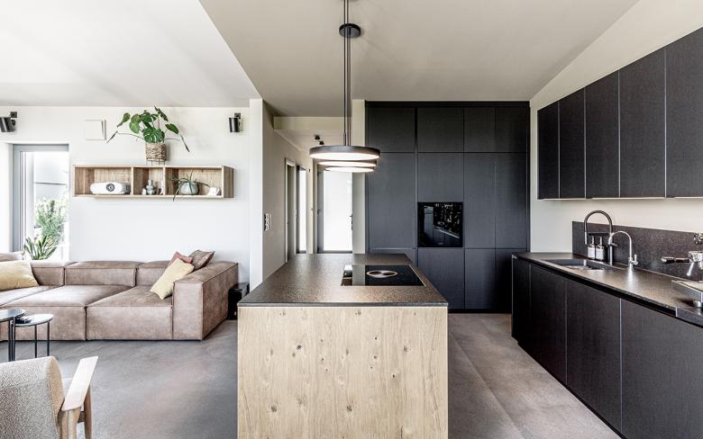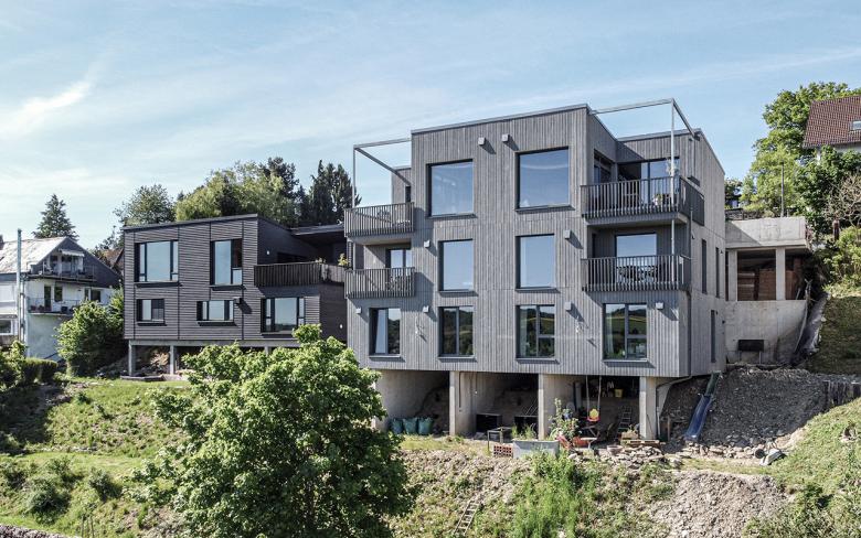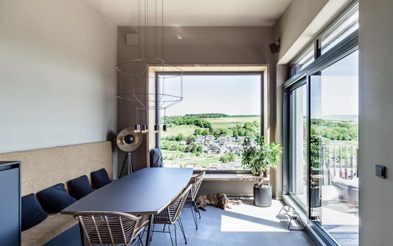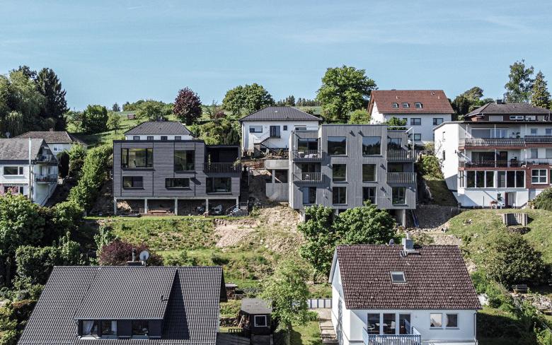 Von der Straße aus kaum sichtbar, entfaltet sich das Haus über drei Ebenen am 45° steilen Hang. Das Wohngeschoss auf der Straßenebene bietet, fast schon erhaben, einen Blick über den Ort und die sanften Hügel des Taunus. Die Terrasse fungiert als Aussichtsplattform, und auch die übrigen Zimmer genießen diesen außergewöhnlichen Ausblick.