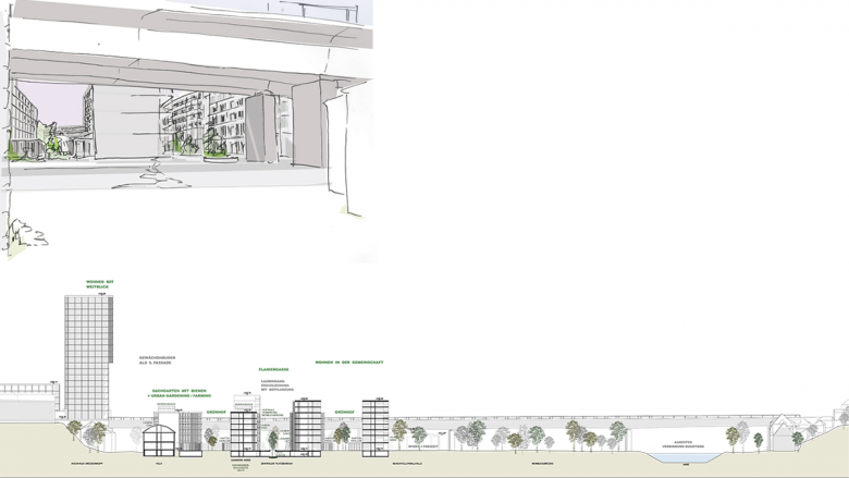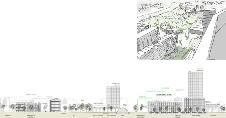 Der Entwurf arrondiert – bei aller noch so hoch angesetzten Ausnützung des Stadtbodens – räumliche Verbindungen in Nord-Süd-Richtung. Und zwar über die unterschiedlichen «Sektoren» der gegenwärtigen und geplanten Nutzungen hinweg: Denn nur mit einer Durchlässigkeit in Flussrichtung und über alle Teilbereiche hinweg bleibt der Zusammenhang der Schwemmebene lesbar.