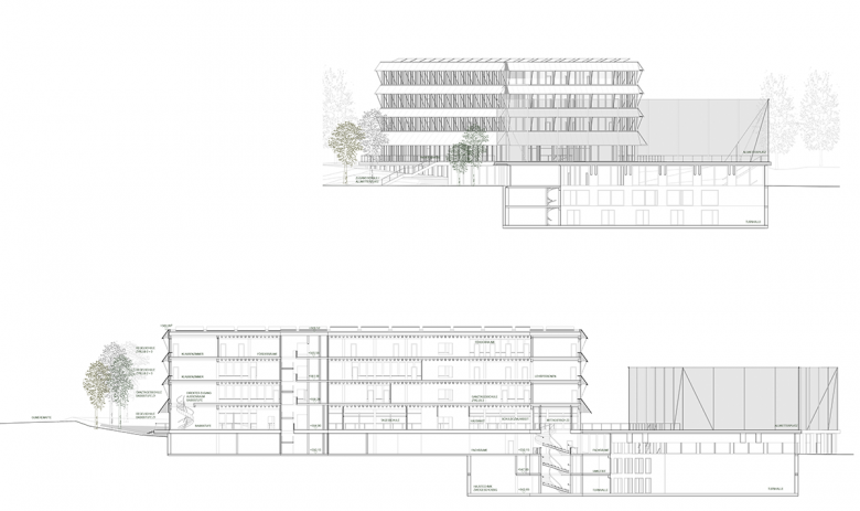Der gegenüber der Goumoënsstrasse an den äussersten Rand der Parzelle verschobene Neubau erhält den Grünraum in seiner heutigen Ausdehnung und verschafft dem Schulhaus eine entspannte Eingangssituation: Die bauliche Konzentration der Flächen ermöglicht Schule wie Nachbarschaft divers nutzbare Aussenraumflächen, die mit ihrem Baumbestand grosses Potential haben für sehr unterschiedliche und auch kleinräumige Nutzungen. Der Neubau entwickelt aus der von Westen nach Osten hin abfallenden Topographie eine horizontale Plattform auf der Kote 554m üNN – ähnlich einem grossen Tisch. Diese künstliche Ebene ragt zum Bahntrassee hin als eingeschossiges Sockelgebäude aus dem Boden. Am andern Ende, zur Gummere-Matte, hebt sie als umlaufendes Deck das darauf abgestellte, eigentliche Schulhaus nur knapp übers gewachsene Terrain.