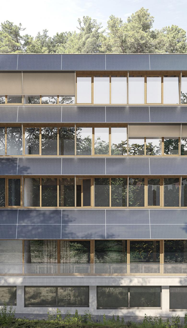 Der Ausdruck des Gebäudes spiegelt seine Nutzung sowohl in der volumetrischen Ausbildung als auch in der konstruktiven Übersetzung wider. Auf die als festes „Deck“ ausgestaltete Schulhofebene mit angeschlossenem Allwetterplatz öffnet sich das Erdgeschoss des Schulhauses. Der rundum verglaste Holzbau erlaubt tiefe Ein- und Durchblicke und stellt sich als ausgefachte Gerüststruktur dar. Seine Geschosse sind sowohl auf die konstruktiven Anforderungen des Holzbaus als auch auf die Flexibilitätsanforderungen neuer Unterrichtsformen hin optimiert: Stützen- Trägerraster, Fassadenraster und kompakte Erschliessungstypologie ermöglichen eine maximal flexible Raumaufteilung und –Zuordnung aufgrund variierender Clustergrössen. Über den Fensterbändern des Holzbaus kragen PV- Module als Brise Soleil aus. Der ganz aussen entlang der Konsolen montierte, textile Sonnenschutz der Obergeschosse läuft von dort über die Führungsschienen zurück aufs jeweilige Fensterbrett: Über das reguläre Volumen des Holzbaus legt sich mit dem Vor- und zurückspringen von Brise Soleil und Markisenführung ein leichtes, spielerisch-bewegtes Ornament.