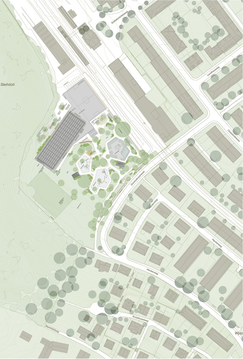 Ausgehend vom Baumbestand der bestehenden Parkanlage konzentrieren sich die Baumassen wesentlich auf den Fussabdruck der zur Disposition gestellten Sportanlagen. Anstelle der Beachvolleyball-Halle wird die neue Turnhalle entlang der Bahngleise errichtet. Das oberirdische Volumen des Schulhauses spannt sich auf zwischen der Turnhalle im Nordosten und der Gummere-Matte im Südwesten – parallel zu Hangfuss und Waldgrenze im Bereich der heutigen Sandplätze. Die neuen Freiflächen für den Sport sind als befestigter Allwetterplatz mit Ballfang auf dem Dach der Turnhalle und als Rasensportfeld im rückwärtigen Bereich der Gummere-Matte angelegt.