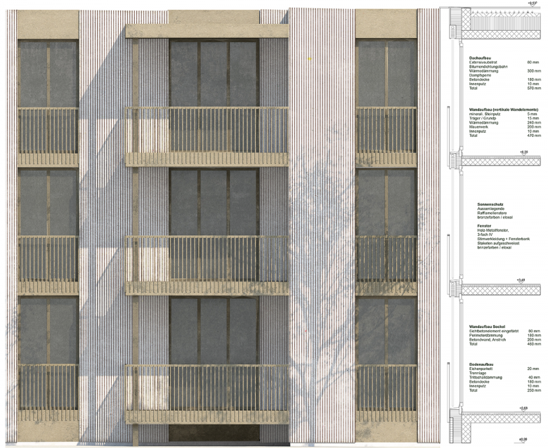 Die Wohnüberbauung nimmt die Kleinteiligkeit ihrer gewachsenen Nachbarschaft auf und spannt zugleich einen in seiner Ausdehnung markanten Aussenraum auf. Mit einer lebendigen Mitte, die innerhalb seiner Nachbarschaft Identität und Adresse schafft. Sie besetzt dazu das Grundstück entlang der Ränder und gibt in ihrer Mitte den grosszügigen und zugleich baulich eingefassten Grünraum frei. Mit ihren zu den Strassenkreuzungen hin offenen Ecken und den jeweils in Längsrichtung gestaffelten Abwicklungen der einzelnen Gebäudezeilen vermeidet die Überbauung den Massstabsbruch der geschlossenen Grossform innerhalb ihrer dispers bebauten Umgebung.