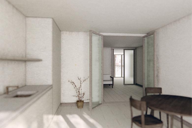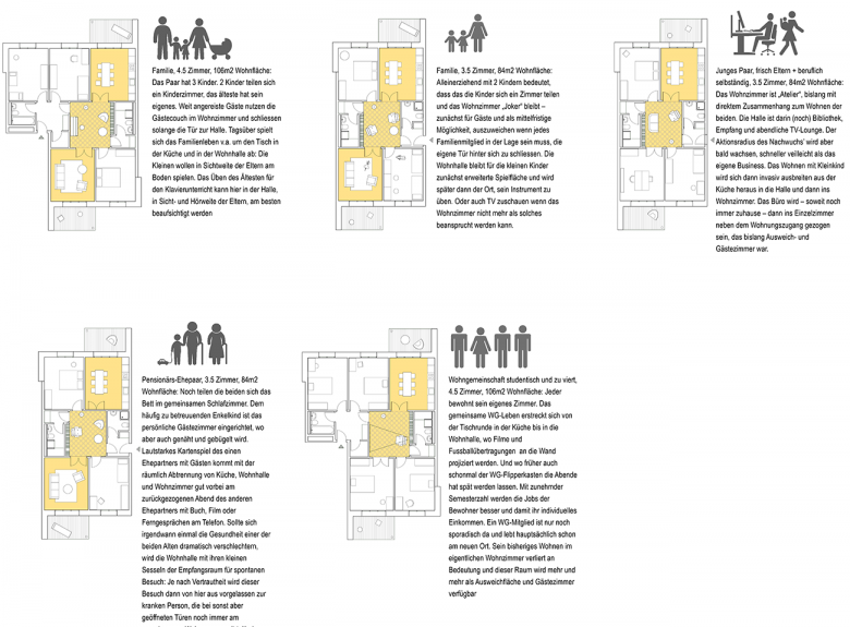 In der versetzten Anordnung des dreiteiligen Wohnbereichs aus grosser Wohnküche, mittiger Wohnhalle und abtrennbarem Wohnzimmer wird der diagonale Durchblick für die einzelne Wohnung aufgenommen. In den 3.5-Zi und 4.5-Zi-Wohnungen gehen aus dieser „grossen Diele“ quer dazu kompakte Korridore und Entrees ab zu den übrigen Zimmern, Nebenräumen und dem Wohnungseingang. Der Grundriss greift mit seiner Aufteilung in einheitliche Zimmer die Qualitäten der „nutzungsneutralen“ Räume des gründerzeitlichen Wohnens im späten 19. Jahrhundert auf. Seine mittige Wohnhalle kann von unterschiedlichen Bereichen her vereinnahmt werden und damit den Bedürfnissen ganz unterschiedlicher Wohnformen, Lebensgemeinschaften und Familiensituationen gerecht werden.
