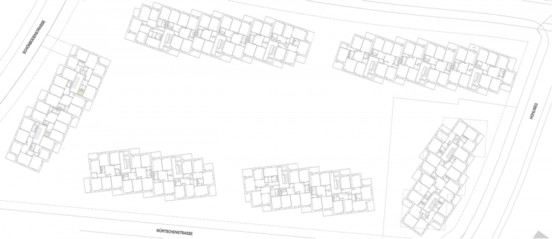 Die gestaffelte Abwicklung entsteht durch leichtes Ausdrehen der einzelnen Hauseineinheiten. Ein weiterer Versatz ergibt sich durch eine Verschiebung beim jeweiligen Treppenhaus. Mit den beiden Versätzen bekommt jede Wohneinheit ihren eigenen Fassadenabschnitt und damit ihre eigenen, über Eck geöffneten Aussenräume. Als Nische schützen sie die Bewohner ohne zusätzliche Elemente vor seitlichen Einblicken. Mit der Ausdrehung orientieren sich die Wohneinheiten der beiden Längsseiten weniger auf ihr unmittelbares Gegenüber sondern stärker in die (tiefere) Diagonale des innen liegenden Grünraums. Die Wohneinheiten orientieren sich dabei sowohl zur innenseitigen Hoffassade als auch nach aussen, zur Strasse hin. Von der beidseitigen Belichtung profitieren sowohl die Wohnungen in den von Ost nach West gerichteten als auch in den von Nord nach Süd gerichteten Zeilen. An den Stirnseiten der Bauten liegen vor allem Wohnungen, die sich über Eck orientieren.