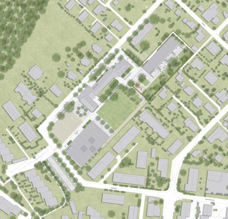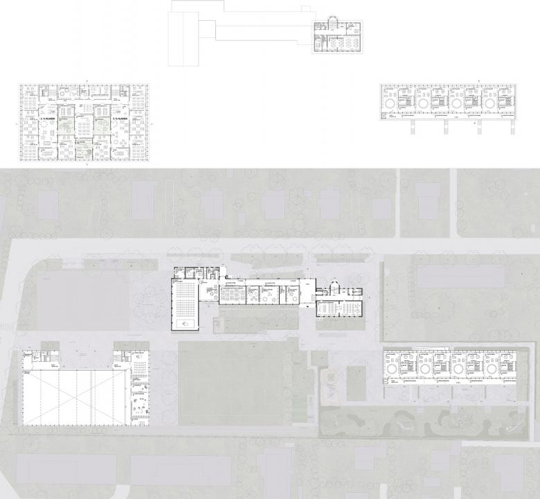 Die vorgeschlagene Erweiterung mit neuer Doppelturnhalle und Unterrichtsräumen für insgesamt 16 Klassen schafft die Möglichkeit, das historische Schulhaus ins Zentrum eines erneuerten Campus’ zu stellen, der in 2 Etappen über 2 grosse, jeweils zweigeschossige Neubauten entstehen wird: Zunächst weichen die Provisorien im Südwesten des Areals dem neuen Hallengebäude, das in seinem Obergeschoss die Unterrichtsräume der beiden Primarstufen-Cluster unterbringt. In einem zweiten Ausbauschritt ersetzt eine neue Zeile für alle 8 Basisstufenklassen die alten Kindergärten im Nordosten des Areals. In der dritten Bauetappe werden im Altbaukomplex die für das ganze Schulareal zentralen Funktionen wie Aula, Ganzstagesbetreuung, Schulbibliothek, Werkunterrichtsräume und Förderzentrum eingerichtet. Somit wächst über die 3 Ausbauetappen ein nach Altersstufen gegliederter Campus mit einer alternierenden Abfolge von Gebäuden und Freiflächen. Das Areal wird im Vollausbau v.a. entlang einer inneren, zentralen Erschliessungsachse in Längsrichtung erschlossen.