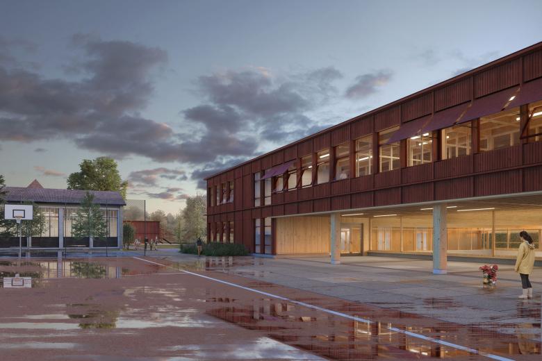Die neue Doppelturnhalle wird am südwestlichen Ende des Areals um zwei Geschosse ins Terrain versenkt. Der Luftraum der Halle ragt ins umlaufend verglaste Erdgeschoss mit gedeckter Pausenhalle und den Musiksälen. Zwei Treppenhäuser erschliessen ab der Pausenhalle mit je eigenen Zugängen die beiden Cluster der 3. + 4. Klasse und der 5. + 6. Klasse im Obergeschoss sowie die getrennt nutzbaren Hallenteile im Untergeschoss. Oben legen sich beide Cluster mit jeweils 4 Klassenzimmern um eine grosszügige Multifunktionszone. Zwischendrin Lehrerzimmer mit Schulleitung und der Informatikraum. Drei kleine Innenhöfe bringen Tageslicht in das raumhaltige Fachwerk aus Holz oberhalb der Halle und erweitern die dortigen Unterrichtsflächen um geschützte Aussenklassenzimmer.