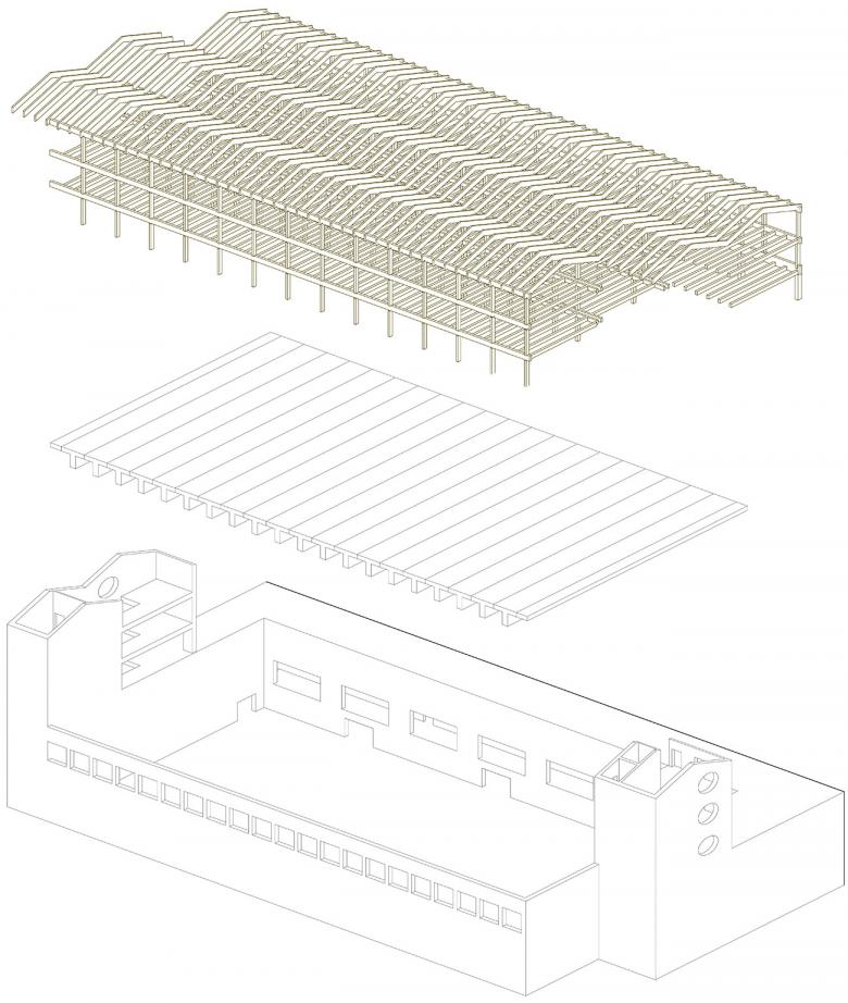 An den beiden Kopfenden erschliessen Treppenhäuser Ober- wie Untergeschosse des Neubaus. Ihre kompakten Abmessungen bedingen Einschnitte des oberirdischen Volumens, mit denen die Stirnseiten verjüngt und die Fassadenlängen verkürzt werden. Der Massstab von Schulanlage und Nachbarschaft wird darüber hinaus aufgenommen in der Überdachung mit 3 Dachgiebeln in Längsrichtung, entsprechend den 3 inneren Raumschichten aus Mittelzone und Unterrichtsräumen.