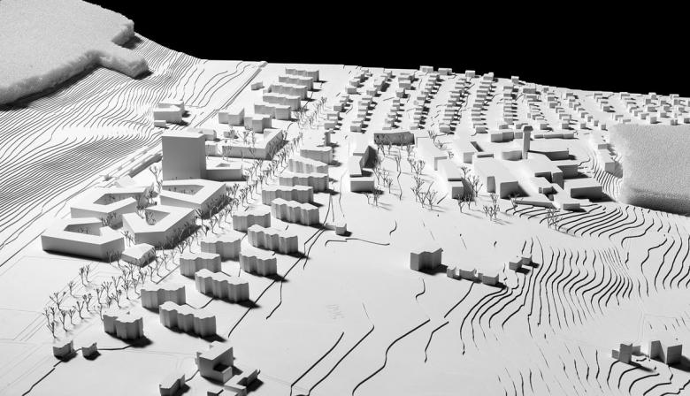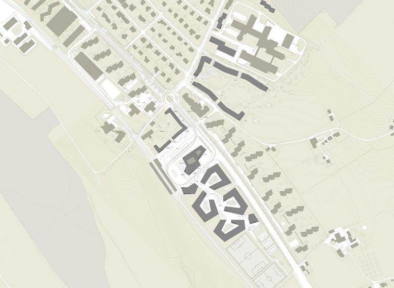 Städtebauliche Planung Zentrumsentwicklung / Am Fusse des Gurten, des Berner Hausbergs im Süden der Stadt, bedingt ein geplanter Knoten aus S-Bahn, Tram und Bus 20 Hektar Siedlungsrand neu zu ordnen. Um die betreffenden Teilgebiete hier, entlang der Ausfallachse Seftigenstrasse, mit den geforderten 2'000 Büroarbeitsplätzen, 300 Wohnungen, Einzelhandelsflächen und Infrastruktur stadträumlich zu "befestigen", werden sie von ihren jeweiligen Rändern her besetzt: