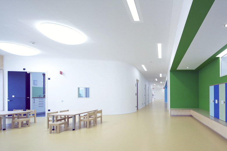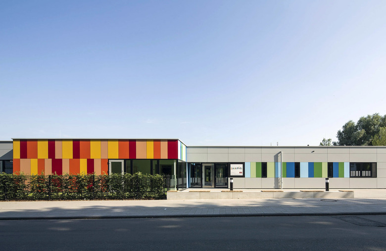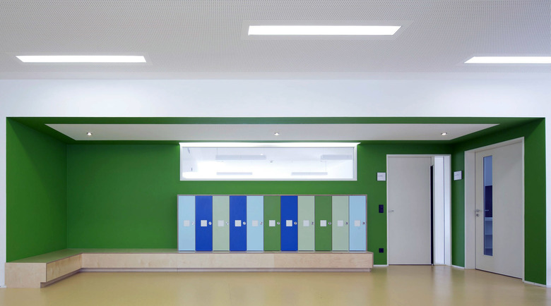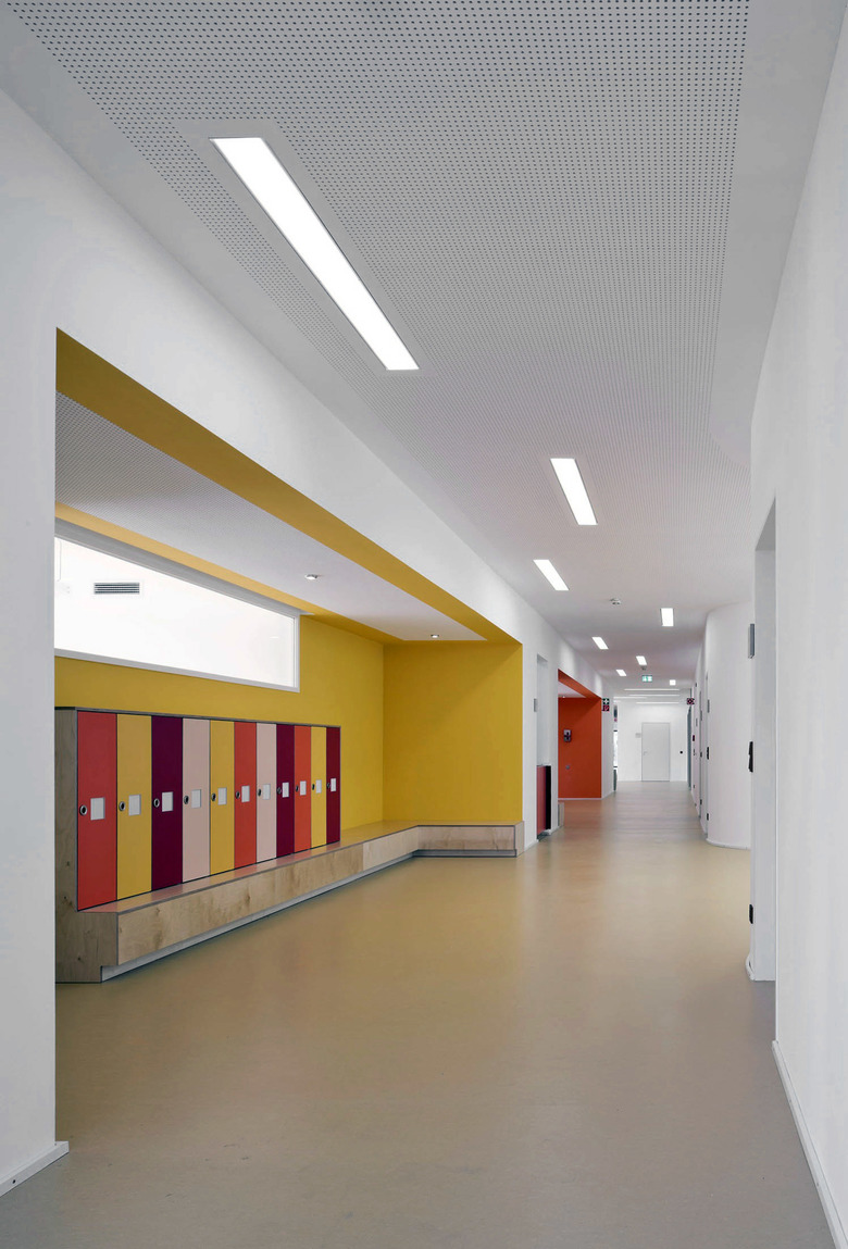 Das Farbkonzept der Fassade findet sich im Innenraum wieder. Jeder Gruppe wurde eine der vier Grundfarben zugeordnet. Die Garderobenschränke wurden entsprechend der Fassade in den unterschiedlichen Farben gestaltet.