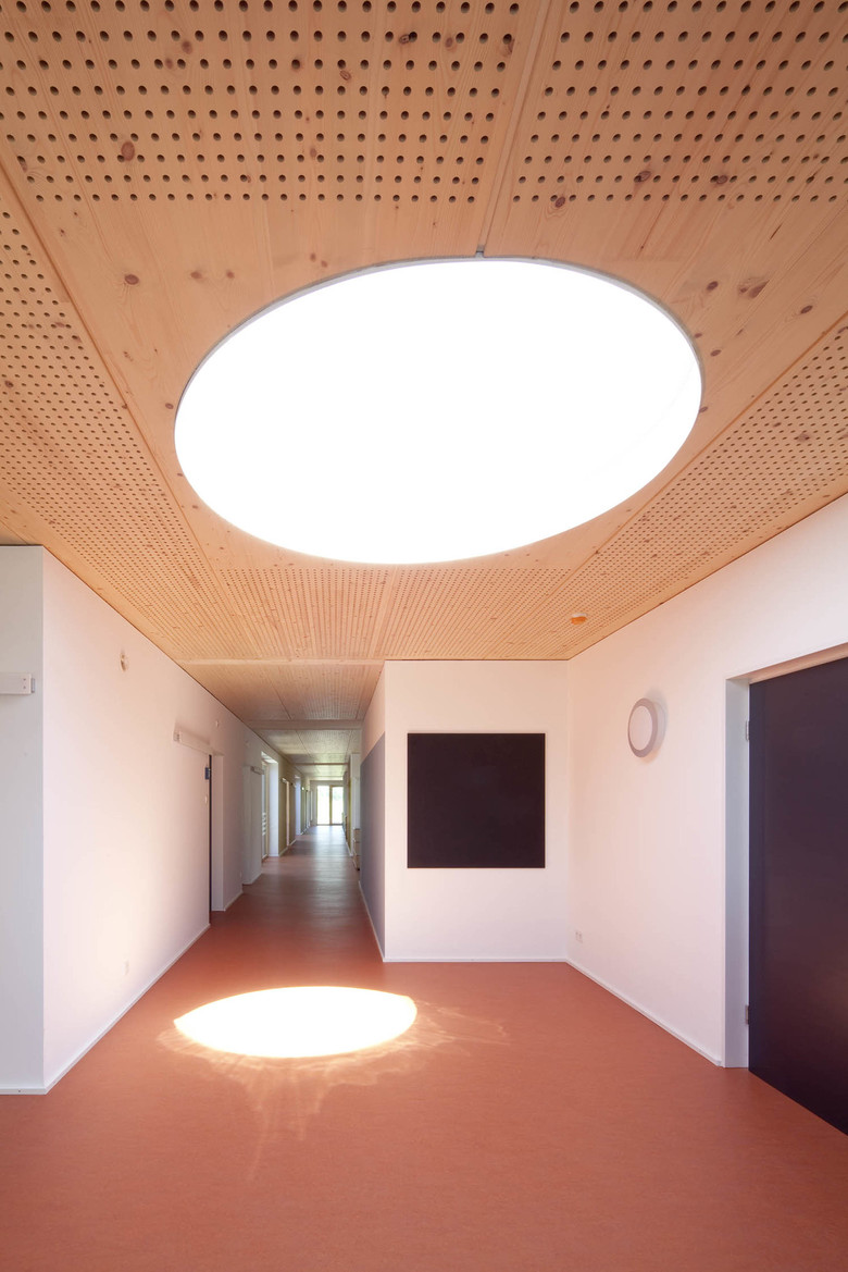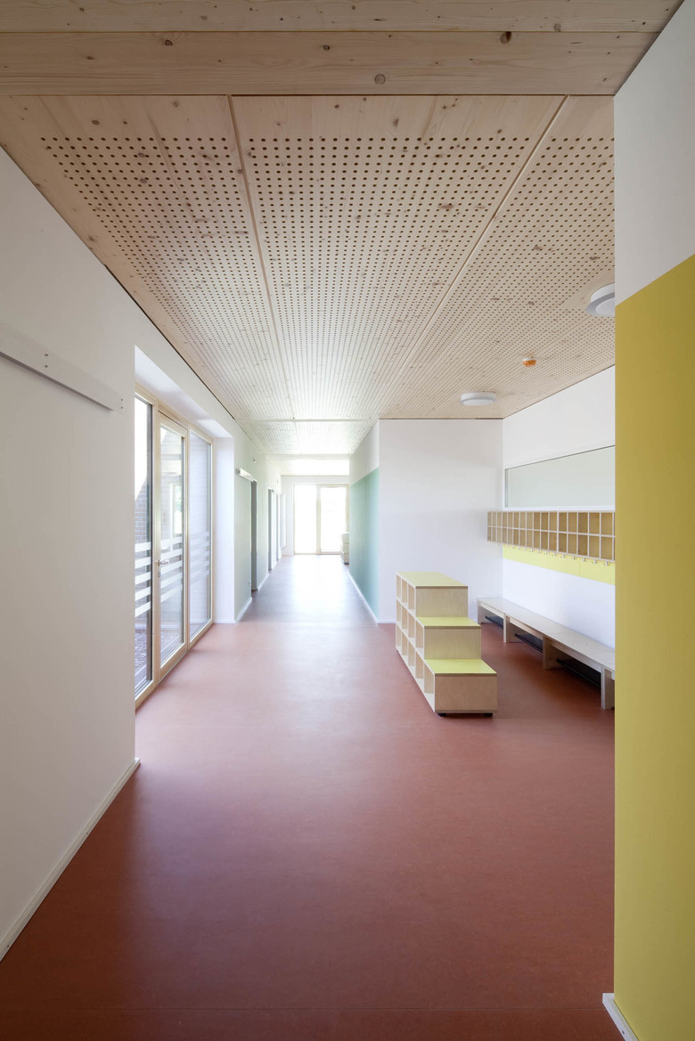 Der Kindergarten ist so konzipiert, dass die Gruppeneinheiten im Grundriss klar ablesbar sind. Die Gruppen- und Gruppennebenräume orientieren sich zum Freibereich nach Südwesten. Die in der Fassade zurückliegenden Gruppennebenräume haben vorgelagerte Terrassen. Die Sanitärbereiche sind den Gruppenräumen direkt zugeordnet. Die Küche, der Personalraum und die Schlafräume befinden sich jeweils auf der anderen Flurseite in einem ruhigeren Bereich. Geschickt angeordnete Innenhöfe belichten die Flurzonen und die angrenzenden Schlafräume und schaffen so einen natürlichen Lärmschutz zu der angrenzenden Außenspielfläche des Jugendbereiches.