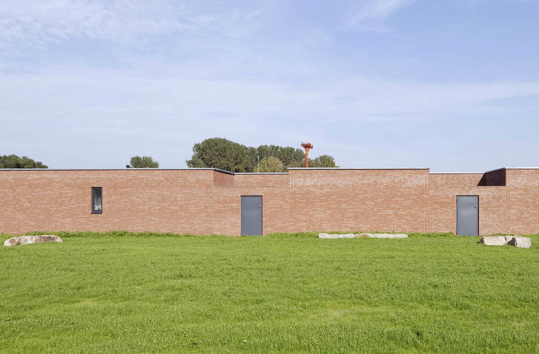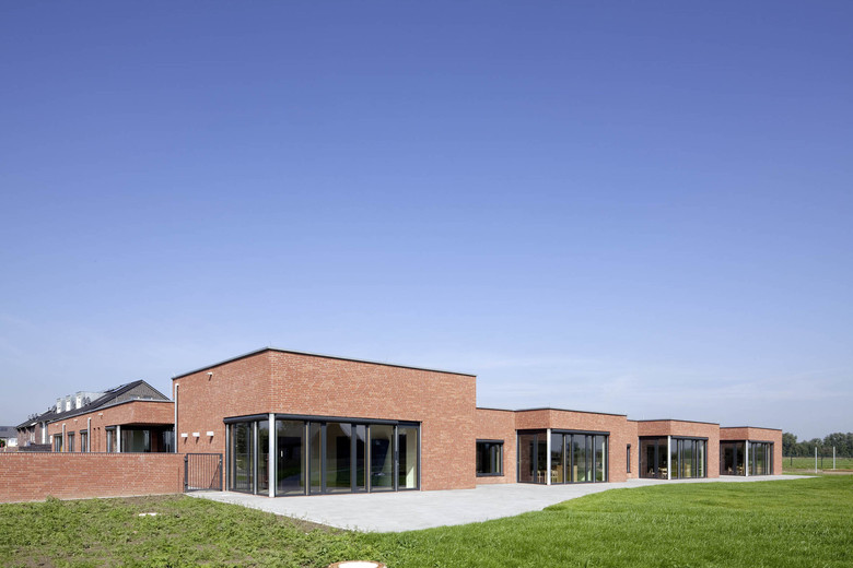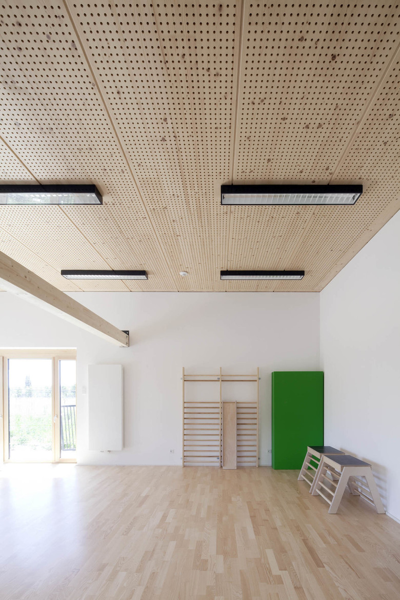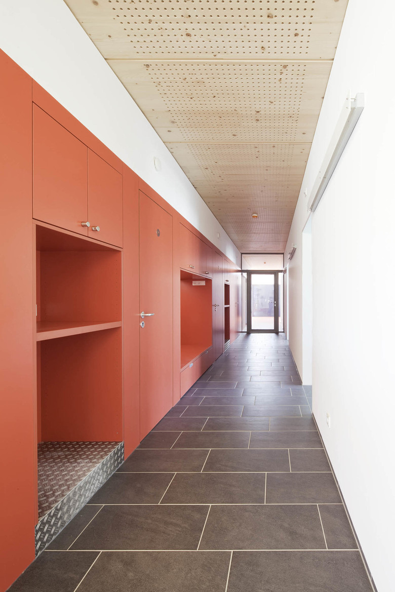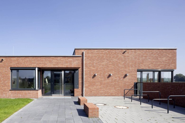Das Gebäude ist mit einem hellroten Klinker verblendet. Die Fenster sind als Holz-Aluminiumfenster ausgeführt. Als tragende Decken wurden Holzkastendeckenelemente eingesetzt, die den notwendigen Schallschutz bereits integriert haben und die im Innenraum eine angenehme warme Atmosphäre erzeugen.