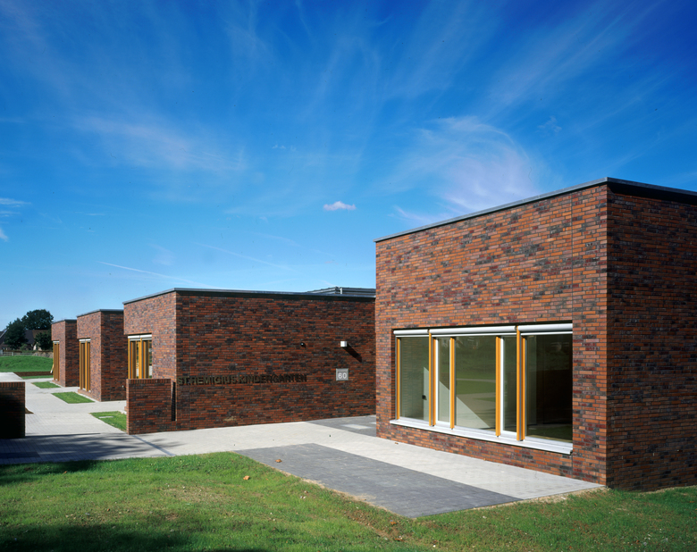 Der Kindergarten ist Teil eines Gebäudeensemble aus Kindergarten und Pfarrheim -welches voraussichtlich 2005 in einem 2. Bauabschnitt realisiert wird. Beide Baukörper gruppieren sich um einen kleinen Platz, der als Veranstaltungsfläche, als Spielfläche oder als Treffpunkt für die umliegenden Anwohner genutzt werden kann.