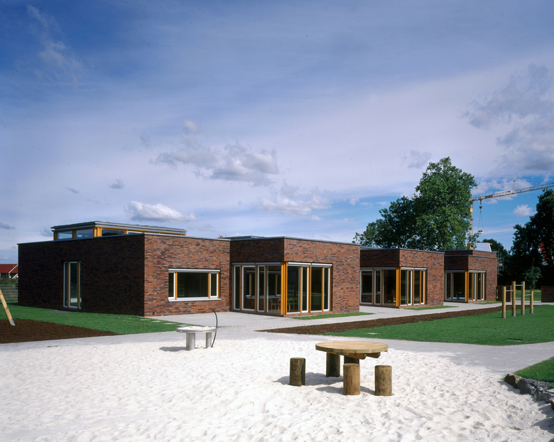 Es kommen ausschließlich natürliche Materialien zum Einsatz: Sichtbare Holzdecken, Verblendmauerwerk, Holzfenster, Linoleumbelag in den Gruppenräumen und Fluren, Eschenparkett im Mehrzweckraum. Das Flachdach ist als extensives Gründach ausgebildet.