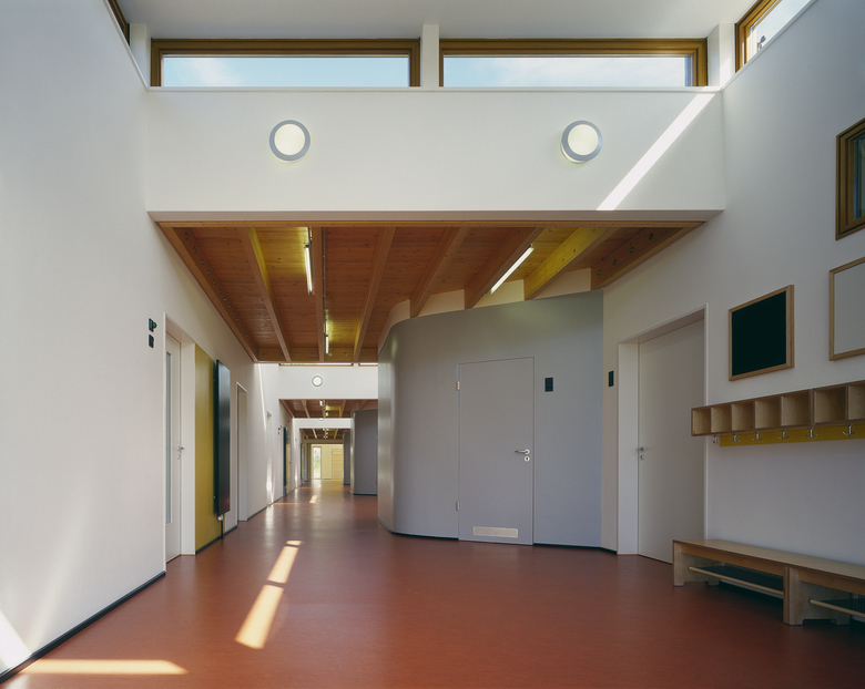 Die Gruppenräume mit ihren Nebenräumen orientieren sich nach Süden zum Freibereich. Die Nebenräume liegen zurückversetzt und haben jeweils eine vorgelagerte Terrasse. Die Gruppenbereiche werden über großzügige Oberlichtkränze im Flurbereich akzentuiert und belichtet. Der Mehrzweckraum befindet sich vor Kopf an der Eingangshalle. Er kann über Faltwände mit dieser verbunden werden. Der prägnante einfache Baukörper schafft eine gute Orientierbarkeit und eine gute Organisation. Die Flurbereiche sind so dimensioniert, dass sie als Spielflächen mit genutzt werden können.