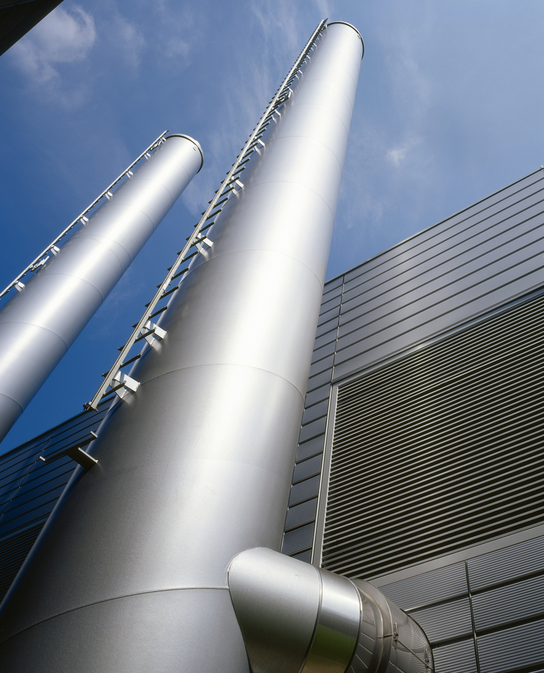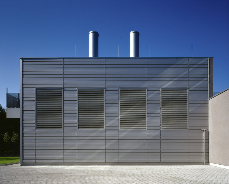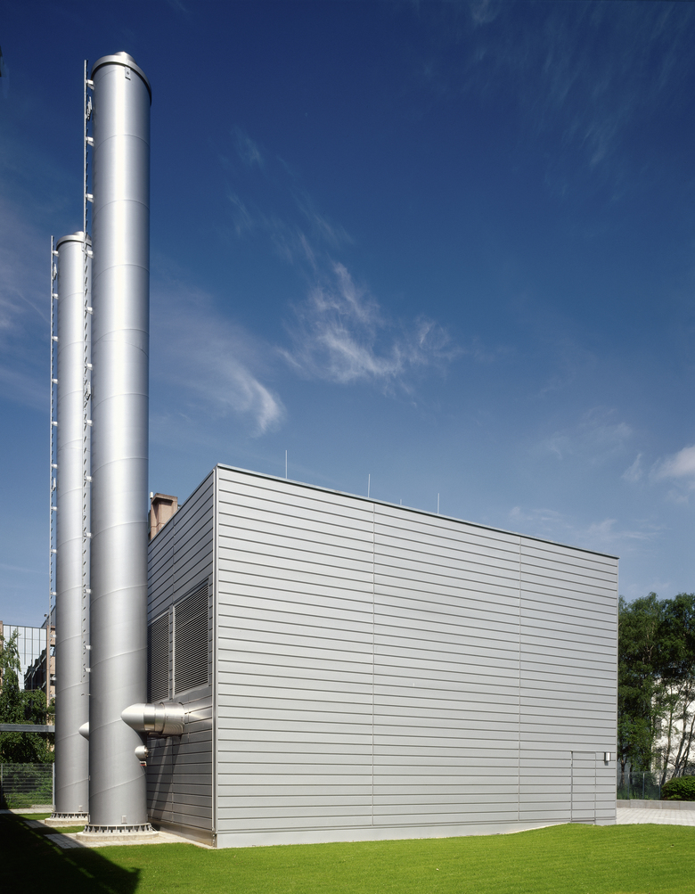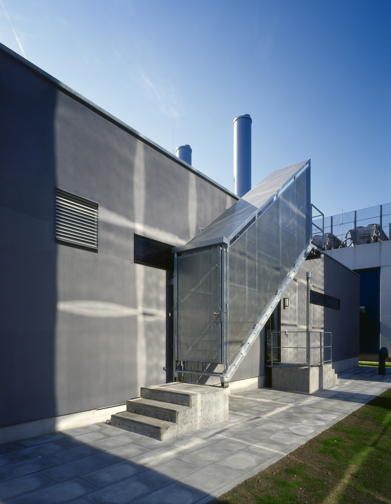 An ein lang gestrecktes Steuerungsgebäude als Massivkonstruktion in dunklem Verputz schließt sich die Aggregatehalle mit den Notstromdieseln an. Die Halle ist als Stahlskelett-Konstruktion ausgebildet. Die Außenhaut besteht aus silberfarbigen Stahlblechen in Elementbauweise mit integrierten Lüftungslamellen für die Zu- und Abluft. Die funktionale Zweiteilung in Steuerungsbereich und Maschinenhalle ist im unterschiedlichen Material der Außenhaut sichtbar gemacht. Das Treibstofflager für die Dieselaggregate ist unterirdisch angeordnet.