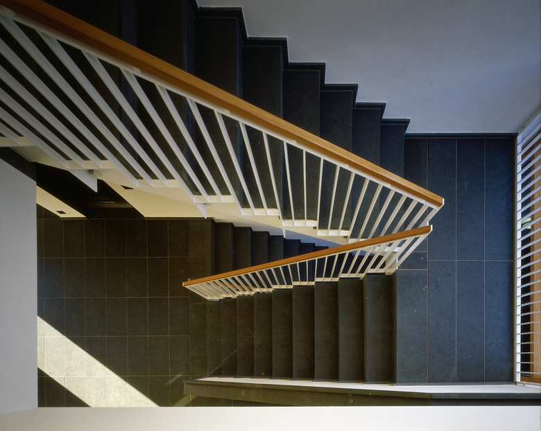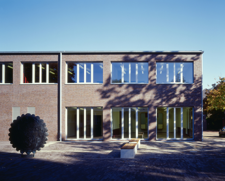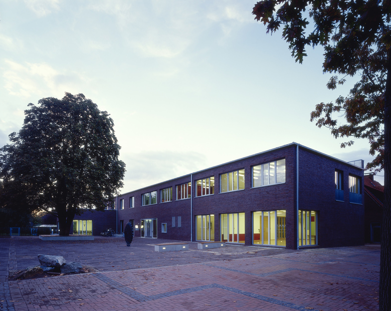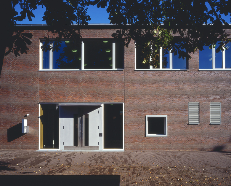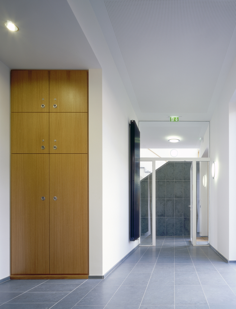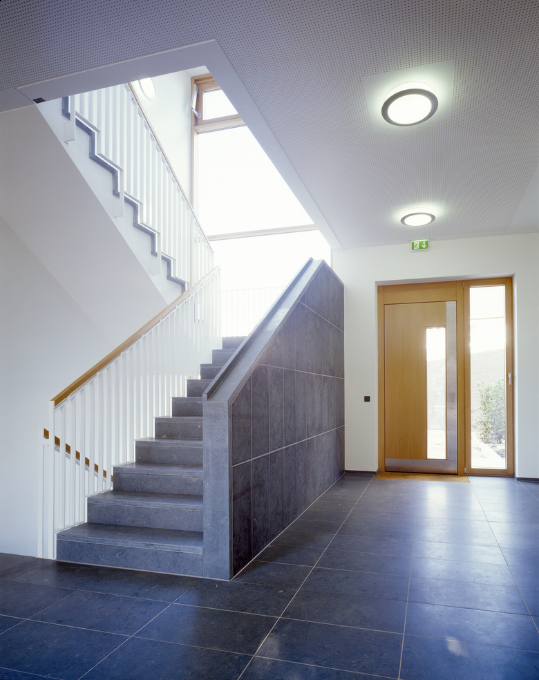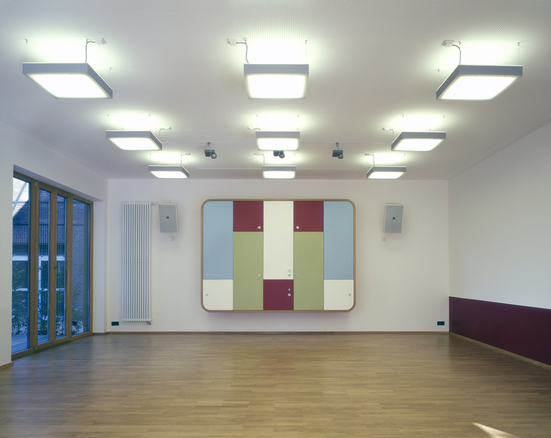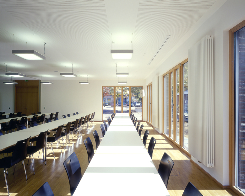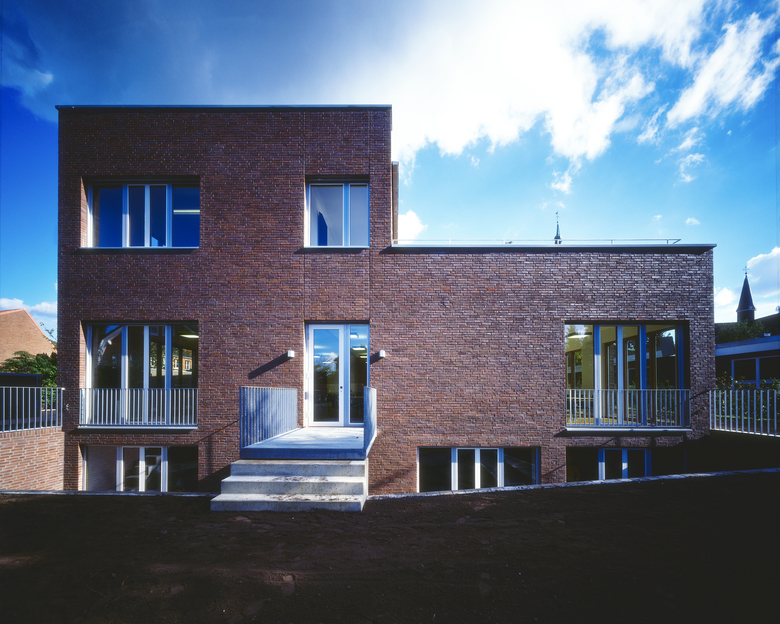 Die Bereiche erstrecken sich jeweils übereinander liegend über zwei Geschosse. Die Erschließungsflure im Jugend- und Erwachsenenbereich sind gegeneinander versetzt (einmal auf der Nordseite und einmal auf der Südseite) und schaffen so eine bessere Zonierung des Gebäudes. Die Mehrzweckräume orientieren sich nach Süden bzw. Osten zum Pfarrplatz. Die Gruppenräume sind hier jeweils unmittelbar zugeordnet. Im Obergeschoss befinden sich die weiteren Gruppenräume und eine Dachterrasse im Süden, die den Gruppenräumen zugeschaltet werden kann. Die Nebennutzzonen (Garderoben, WC, Abstellräume etc.) sind jeweils im Eingangsbereich des Jugend- und Erwachsenenbereichs angeordnet. Das Gebäude ist voll unterkellert. Durch eine Geländeabböschung im Westen des Gebäudes wurden im UG zwei tagesbelichtete Gruppenräume geschaffen, die als Nähschule bzw. als Bastelraum genutzt werden. Darüber hinaus sind ein Billardraum, Hausmeisterraum, Technikräume, Stuhllager und große Lagerräume im UG angeordnet. Der einfache und disziplinierte Baukörper mit seinem braunroten Klinker gibt sich im Inneren abwechslungsreich und differenziert. Gestaltprägende Materialien sind: helles Eichenparkett, roter Linoleumboden, grüner Naturstein, farbige Wände, Einbaumöbel in Eiche oder farbigen Schichtstoffplatten.