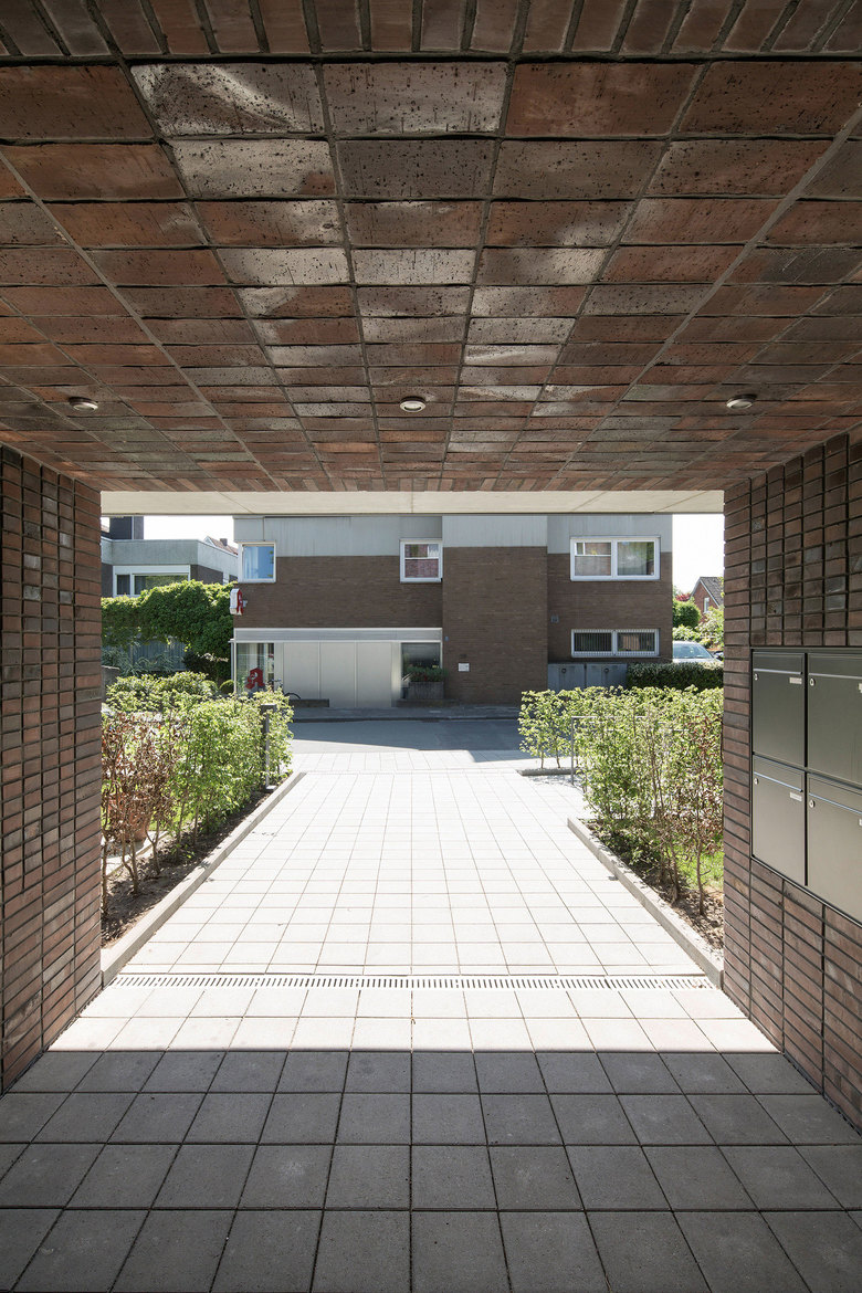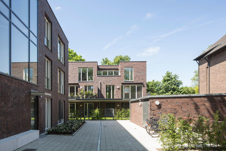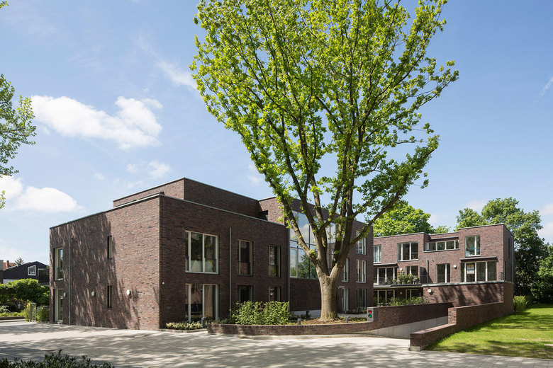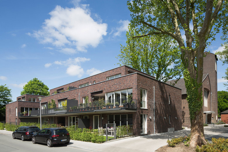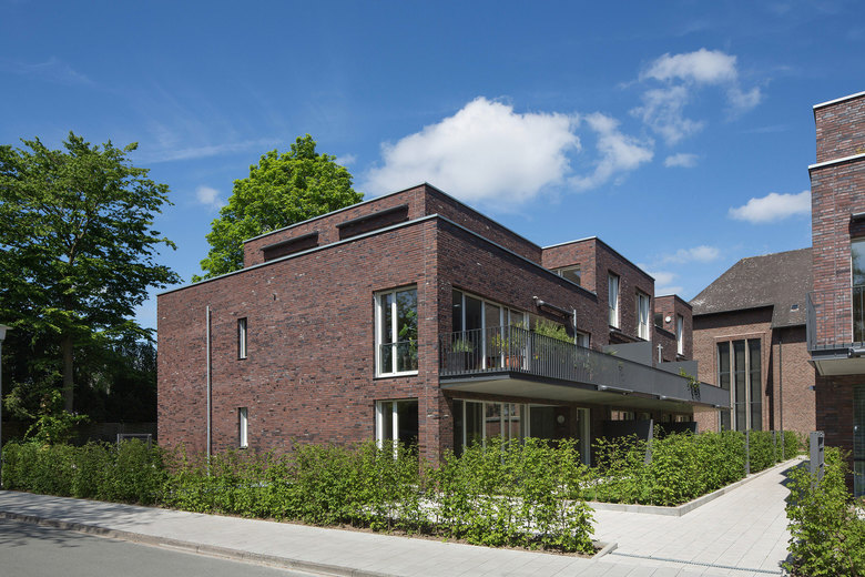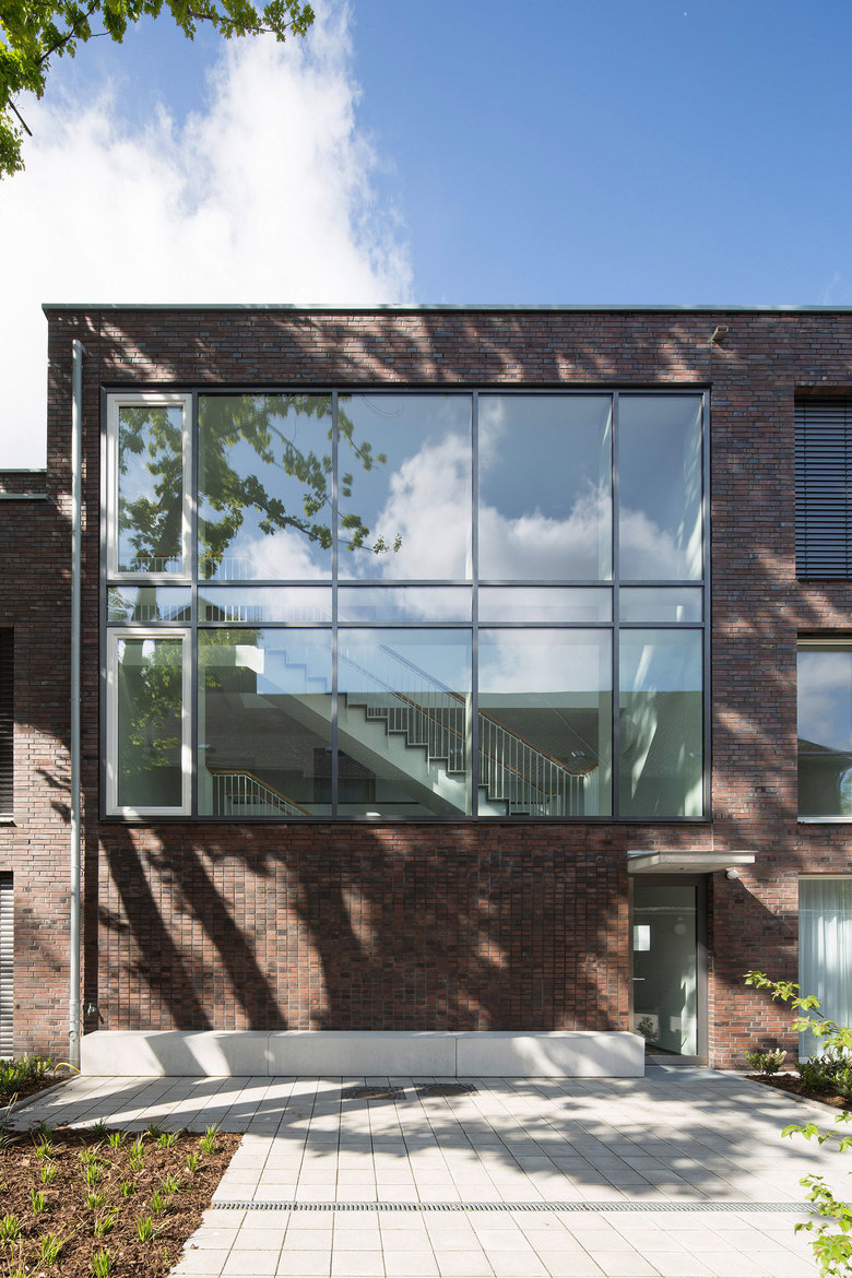 An der Sentruper Höhe wurde die ortstypische Vorgartensituation aufgegriffen, indem die nach Süd-Westen ausgerichteten Wohnungen im EG Terrassen und kleine Gärten erhalten haben. Der nördliche Baukörper streckt sich in die Tiefe des Grundstücks. Die Wohnungen sind hier so organisiert, dass alle Aufenthaltsräume und Balkone nach Süd-Osten hin zum Innenhof orientiert sind. Als Fassadenmaterial wird dunkles Verblendmauerwerk mit weißen Holzfenstern verwendet. In den Treppenhäusern kommt grüngrauer Anröchter Naturstein zum Einsatz.