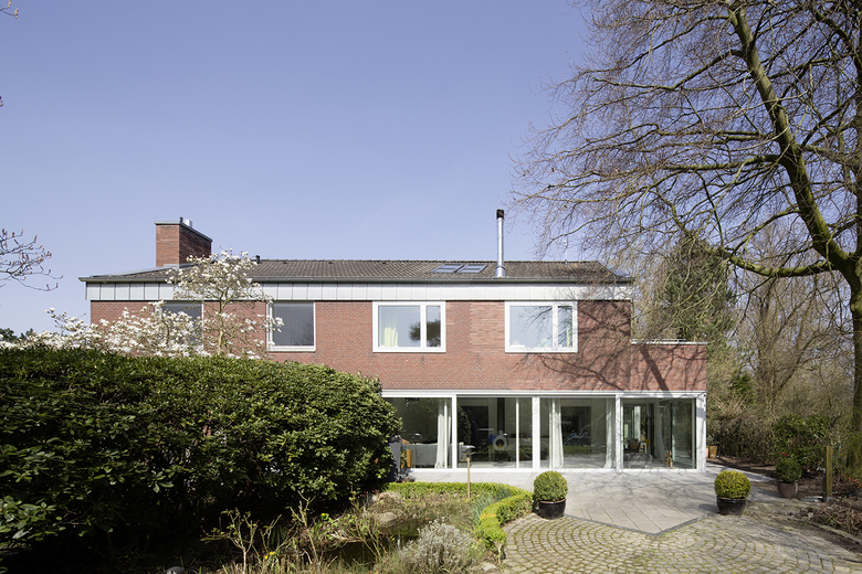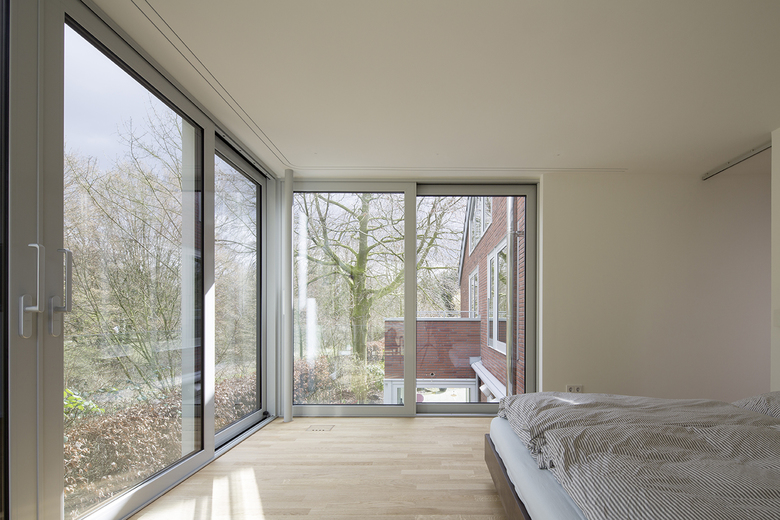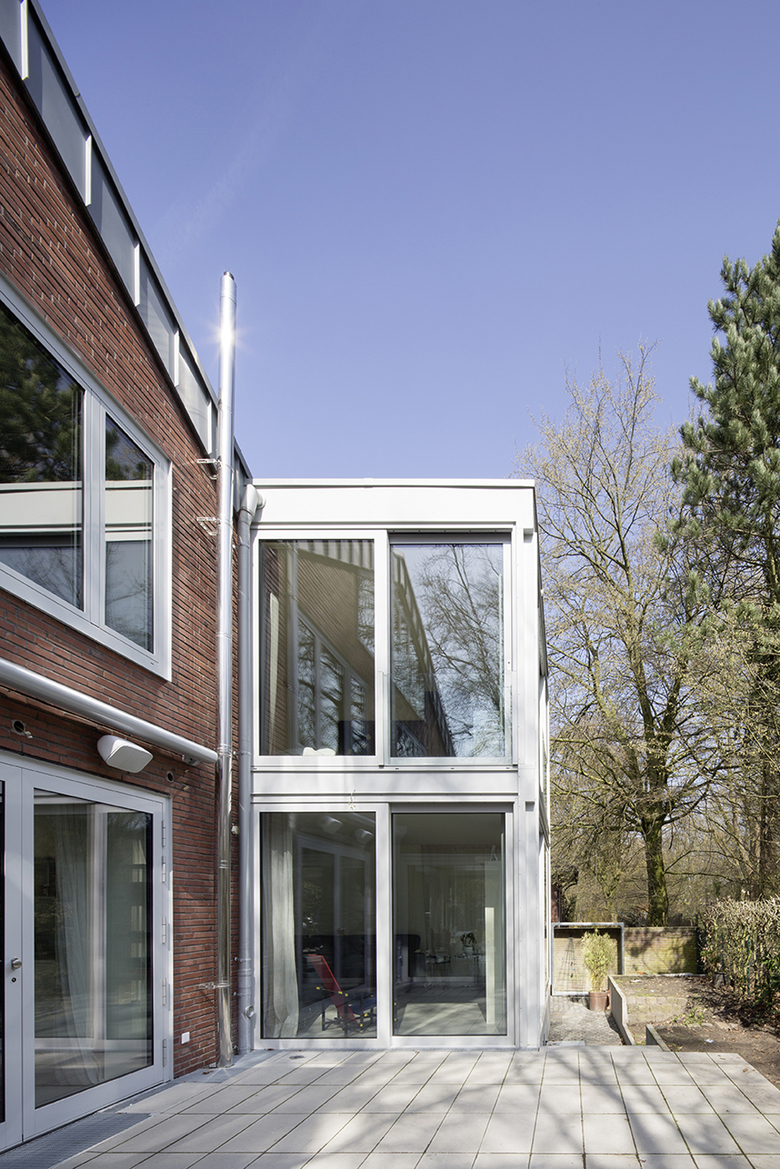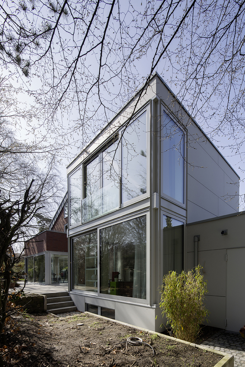 Bei der Umbau- und Erweiterungsmaßnahme wurde dieser Anbau entfernt und durch einen zweigeschossigen Kubus ersetzt, welcher im Obergeschoss im Grundriss diagonal abgeschrägt, wurde, um den Nachbarn weiterhin den Ausblick auf den nahen Kanal zu gewähren.