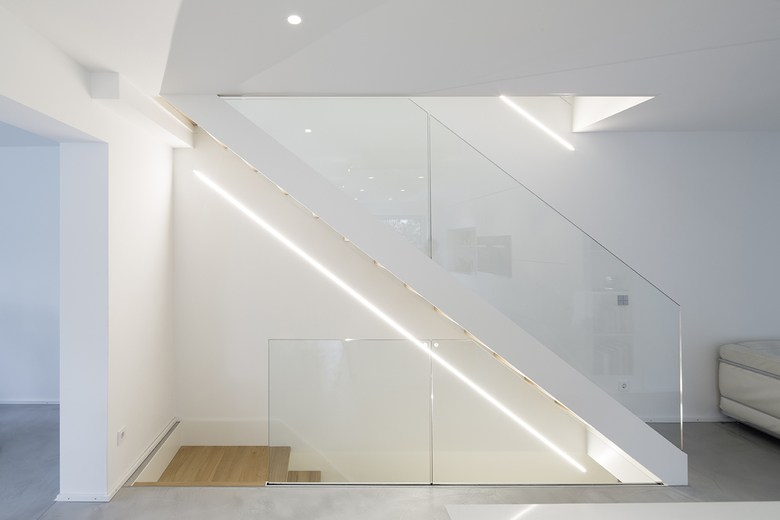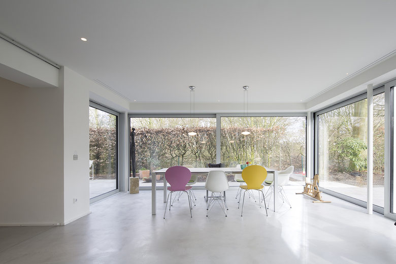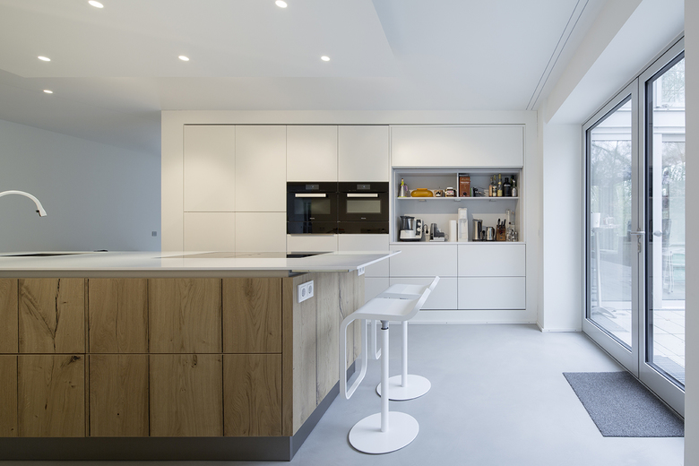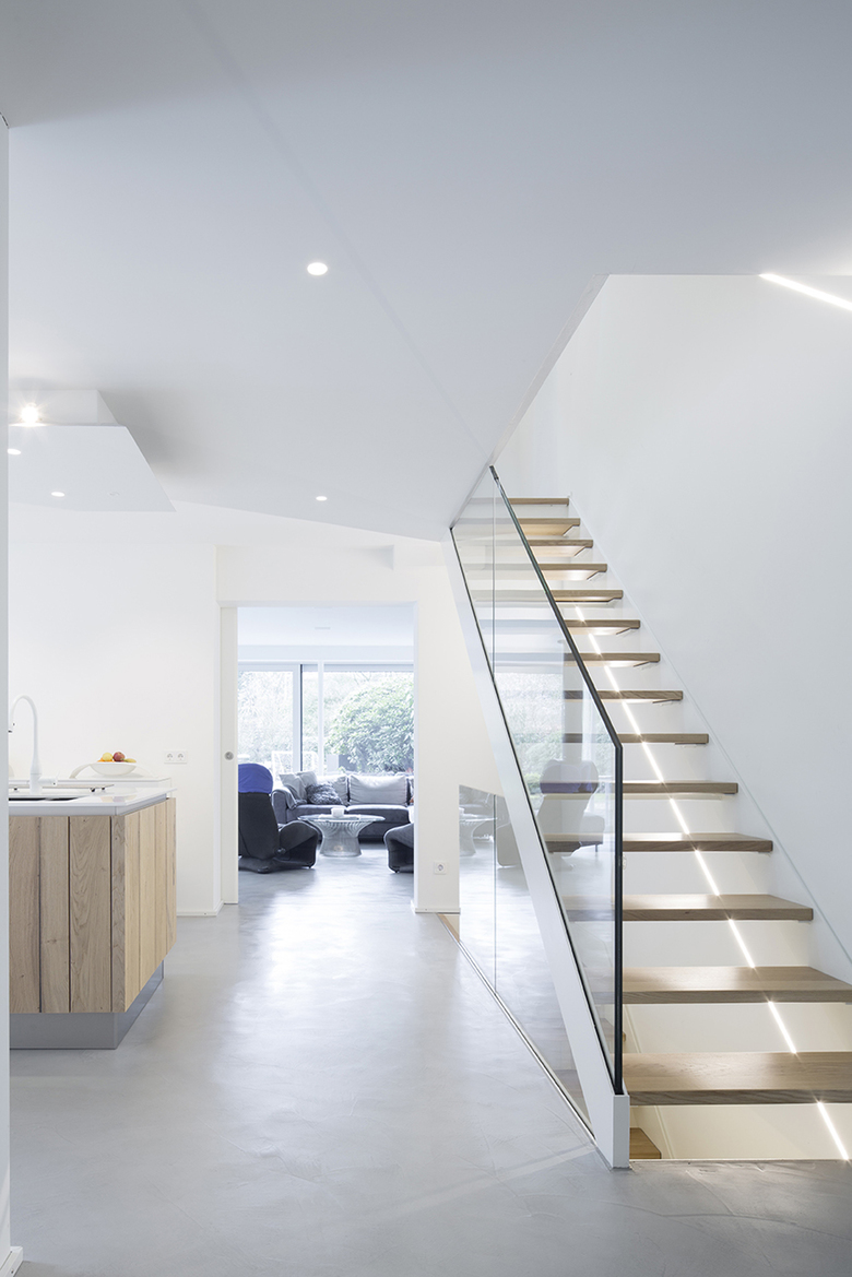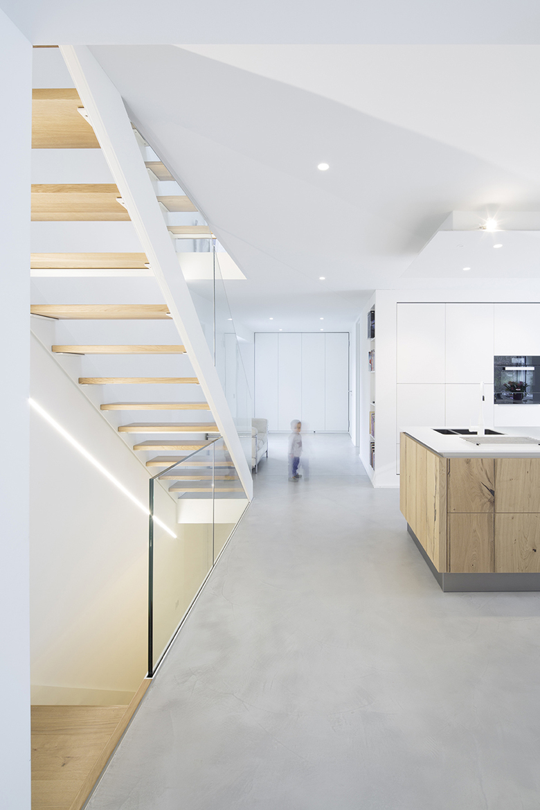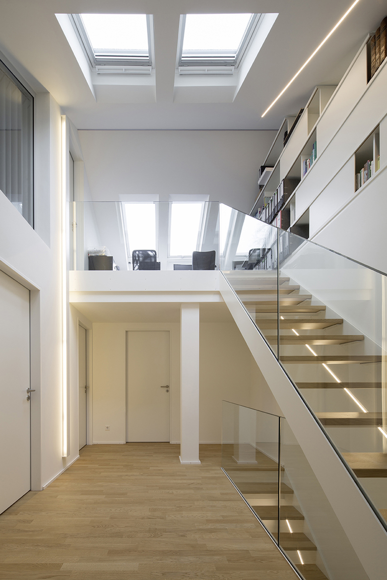 Im Bestandsgebäude wurde die innere Erschließung mit einer neuen, einläufigen Treppe, die bis in das ausgebaute Dach führt, neu konzipiert. Der Wohnraum im Erdgeschoss wurde über einen Anbau nach Osten erweitert und im Obergeschoss wurde der Grundriss neu organisiert, so dass dort zwei großzügige Kinderzimmer, zwei Bäder und ein großer Schlafbereich mit Ankleide entstanden. Das Gebäude bekommt durch den Umbau eine Großzügigkeit und Offenheit im Innenraum, die vor der Maßnahme nicht vorhanden war.