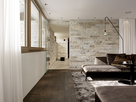 Das Projekt schafft luxuriöse Räume und Rauminhalte, ideale Bereiche für mancherlei Begegnungen vor und nach dem individuellen Wintersport in der Alpenarena. Die Anlage umfasst einen eleganten Partybereich mit Billard- und Cheminéezimmer. Im stimmungsvollen Naturkeller mit angrenzendem Degustationsraum werden edle Tropfen in einmaligem Ambiente kredenzt. Eine total durchdachte und aufs modernste eingerichtete Wellness- und Fitnessanlage, die nichts zu wünschen übrig lässt, lädt – vor oder nach dem Weingenuss - zur Körperertüchtigung oder weiteren, entspannenden Momenten ein.