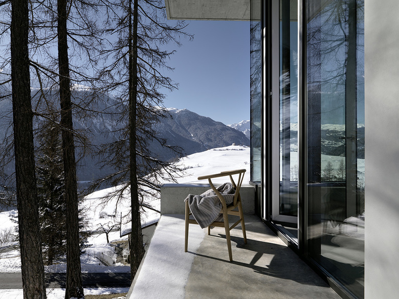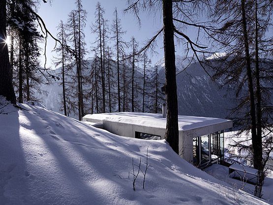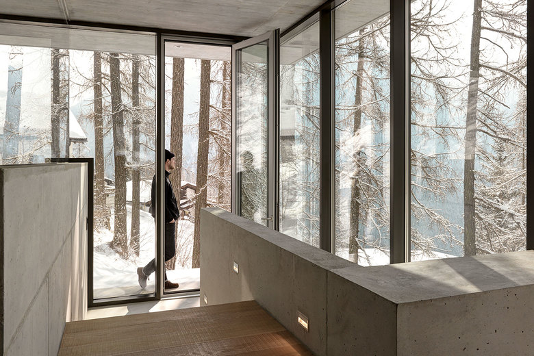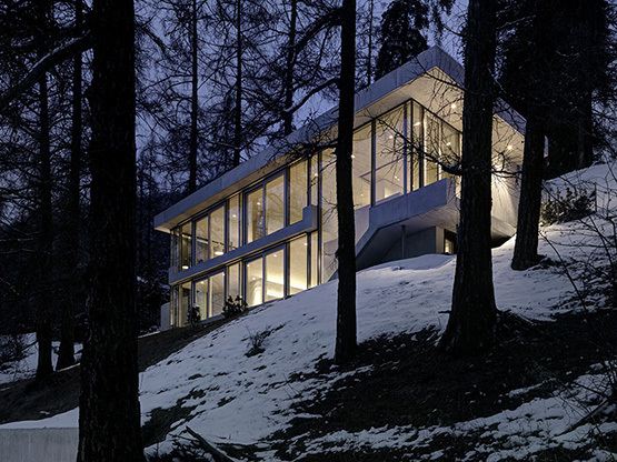 Die ausgeprägte Hanglage nach Südwesten und der Respekt gegenüber dem schönen Baumbestand auf dem Grundstück bilden die Basis für den Entwurf. Sowohl die Anordnung der Geschosse und der Räume, als auch die Ausrichtung zum Berg und zum Panorama leiten sich direkt aus diesem wunderbaren Ort ab und ermöglichen eine nahtlose und feinfühlige Eingliederung in das idyllische Umfeld. Das nach drei Seiten offene Gebäude sitzt in einer Lichtung hoch über der Quartierstrasse und nutzt dabei die umgebenden Baumgruppen für die Strukturierung seiner Innen- und Aussenräume. Während im Wohngeschoss die Tragstruktur offen und schlicht ist, werden im Schlafgeschoss tragende Elemente gezielt eingesetzt, um den Innenraum sanft einzufassen.