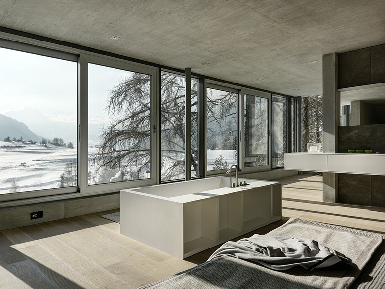 Der Materialentscheid für glatten Sichtbeton widerspiegelt die Ruhe und Echtheit dieses Ortes. Die schlichte, konsequente und gleichzeitig abwechslungsreiche Liebelei mit dem Material Beton entspricht unserer Faszination für diesen einmaligen Bau und das bis ins Detail dreidimensional entworfene Projekt. Die Inneneinrichtung haben wir in Zusammenarbeit mit René Hauser und ausgesuchten Möbelherstellern ausgearbeitet und umgesetzt.