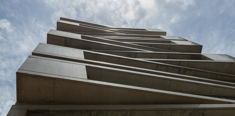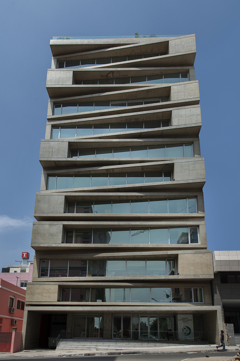 The KN10 Building is located in downtown Luanda, close to Largo da Maianga square. Its sober volumetric presence is defined by its ten modules in exposed concrete resting at differing angles on top of each other.
