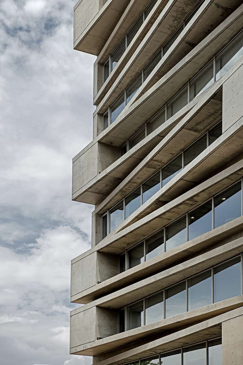 In order to control exposure to the sun, the window spans in each of the ten modules are recessed, enhancing the building’s volumetric presence and identity in the cityscape.