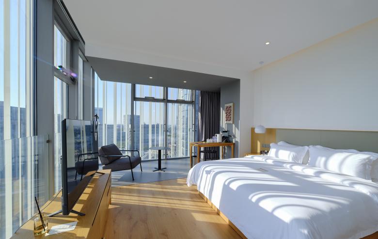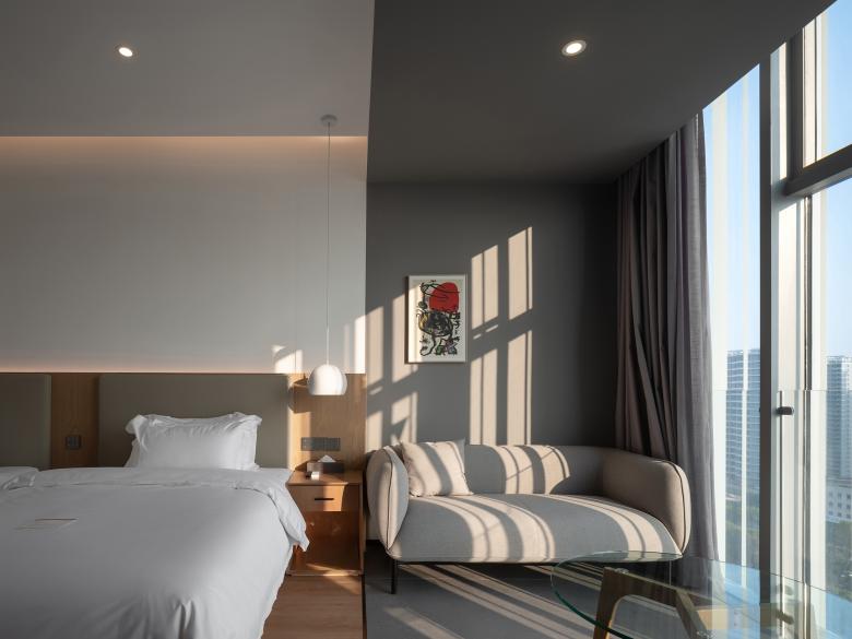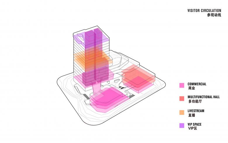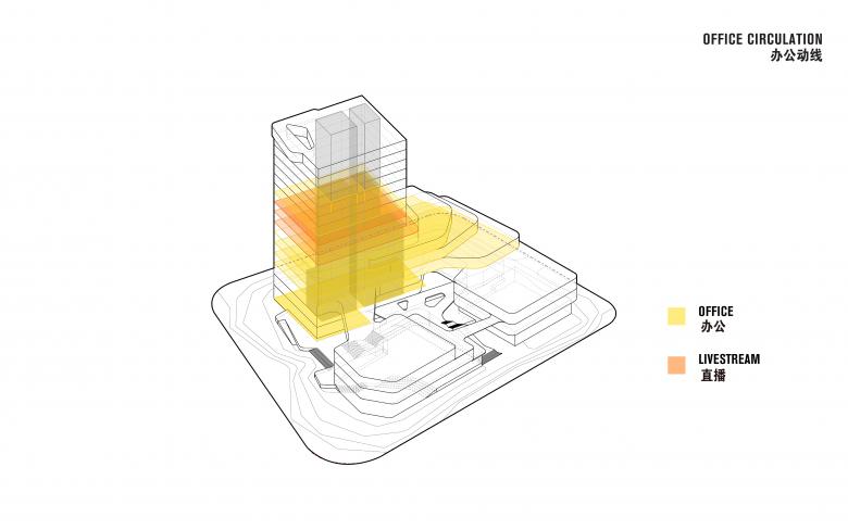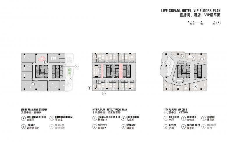 Floors 8–10 host live-streaming studios designed with stainless steel and neon lighting to bridge physical and digital commerce. A public viewing area on the 9th floor allows visitors to observe broadcasts, connecting audiences to Aimer’s online strategy. Above, the hotel spans levels 11–16, offering natural materials, warm finishes, and panoramic lake views. Finally, the 17th floor executive level provides unobstructed vistas through an extruding glass window.