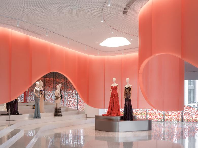The interior extends the idea of fluid connection: curved elements with integrated shelving, a coral-colored polycarbonate ribbon, and rose terrazzo floors create continuity and openness. Wide steps guide visitors smoothly through the showroom, reinforcing the immersive flow.