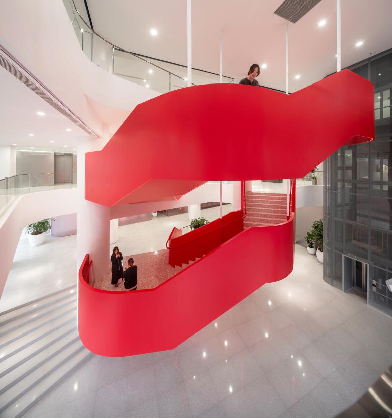 At the northwest entrance, a free-shaped staircase suspended from steel rods serves as a sculptural centerpiece, both functional and symbolic. Doubling as a stage for events, it reinforces the motif of fluidity running throughout the complex.
