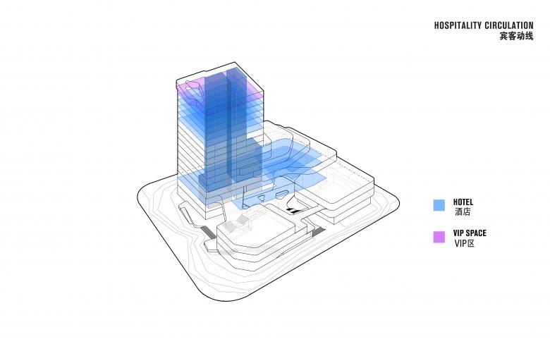 The podium’s flowing lines contrast with the vertical 17-story tower. In the Chinese cultural context, this composition evokes the traditional relationship to nature, where undulating horizontal forms suggest water, while the rising tower recalls mountain peaks. This metaphor symbolizes harmony between architecture and landscape.