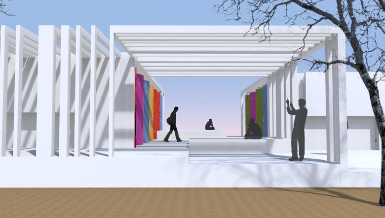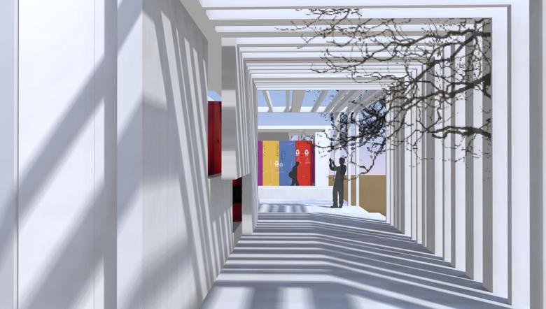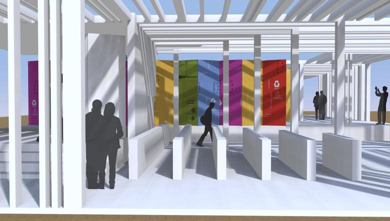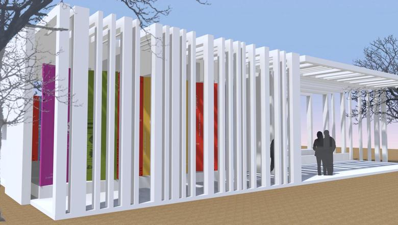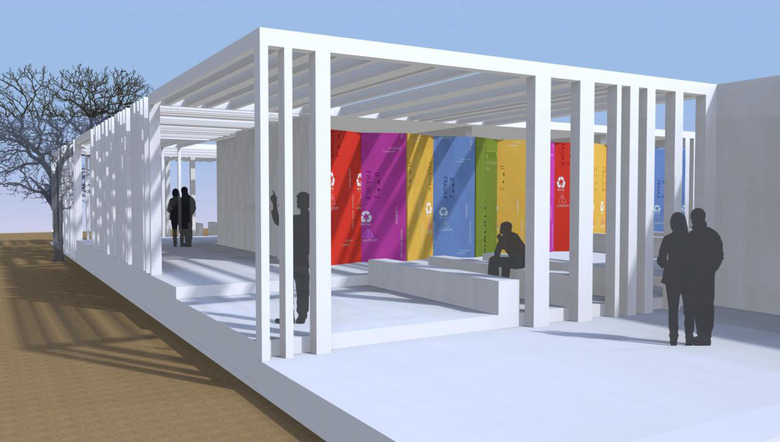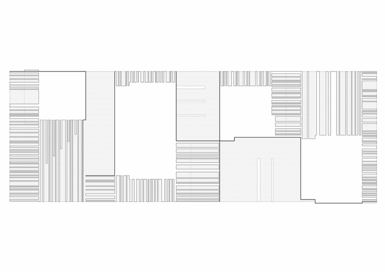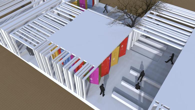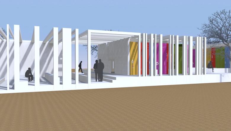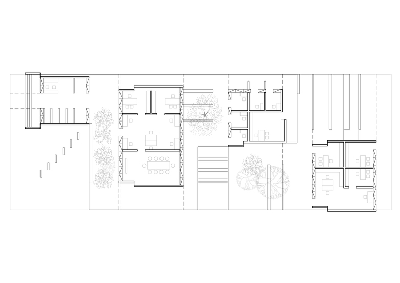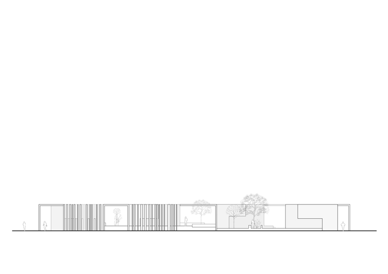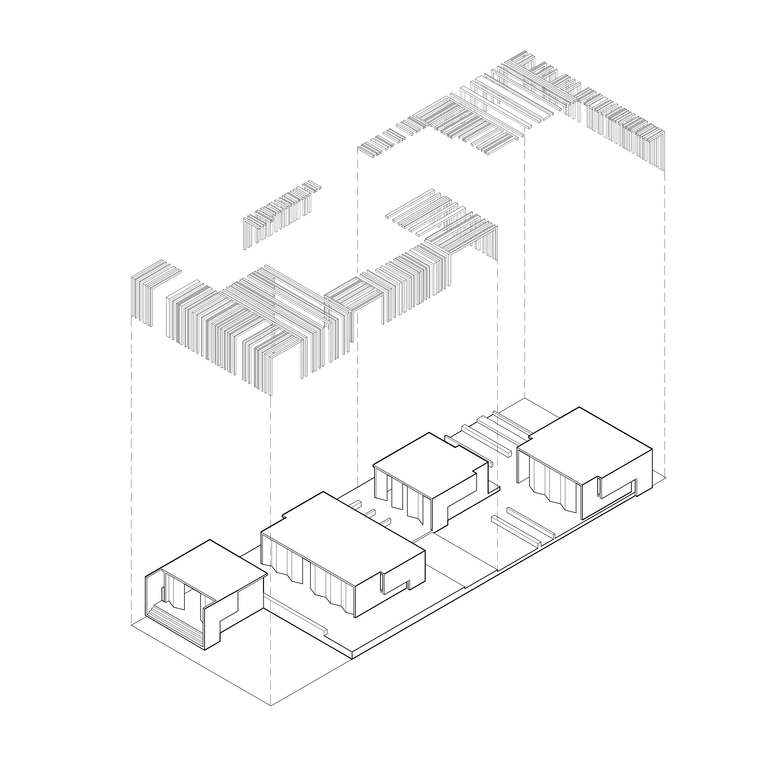 The project is then articulated as a cluster of four concrete boxes sitting on a shared rectilinear plinth. The boxes open out completely on two sides with collapsible panels made out of recycled materials. But it is in the spaces between these boxes that the density of architecture is experienced. Completing the cuboid outlined by the plinth, is a bar-code patterned filigree of ferro-cement pergolas which cast dramatic shadows. Cut-outs in the filigree become courtyards with large shade-giving trees. This entire non-functional envelope then produces a multivalent, playful social space for the various people who need to wait before or after accessing the plant.